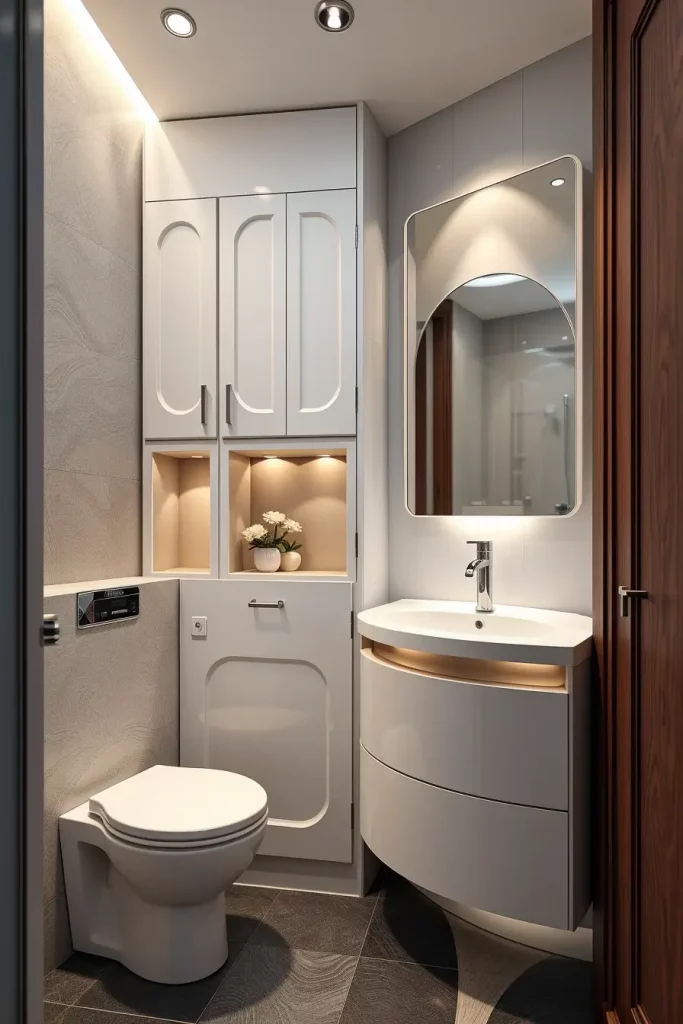 In the choice of cabinetry I use floating soft-edge vanities, curved drawers and rounded wall units. They have streamlined figures that can allow the room to be opened to have enough storage. I like matte lacquer, natural stone facades or soft touch finishes to achieve an elegant appearance. Combining this furniture with curved mirrors, oval basins and smooth lighting, the atmosphere is in a harmony that is functional and luxurious.