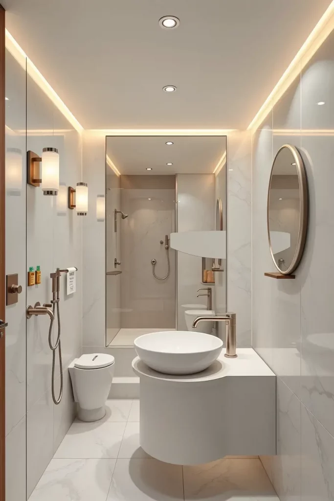 When choosing the technology elements, I choose the items that retain the smooth appearance of the room: oval smart mirrors, curved toilet units with integrated wash features, and built-in speakers that are fitted in the ceiling. These products minimize the clutter and substitute the bulky traditional counterparts, which is very important in small spaces. Another suggestion I would make is that lighting controls should be installed in areas that are user friendly particularly near mirrors and showers.