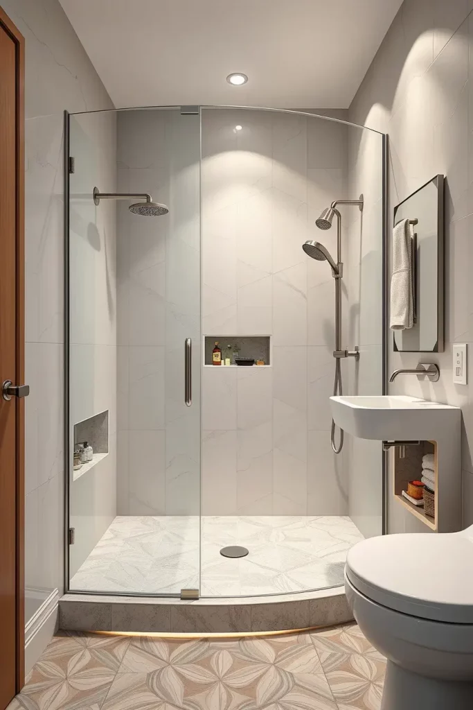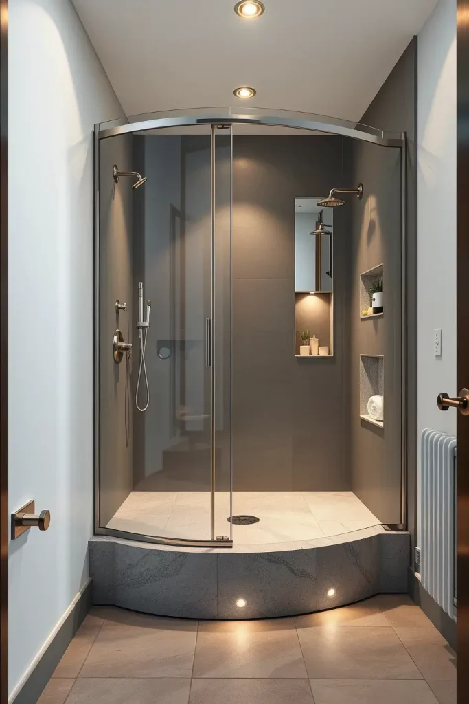 I tend to use frameless glass with mild radius, smooth shower base and storage niches recesses so that the appearance is not cluttered. I would use matte stone surfaces on the shower tray and combine them with designer brushed surfaces to support the luxurious impression. This information enables the shower to be a framed piece of subtle sculpture instead of a visual cue, which makes the room to look more spacious and balanced.