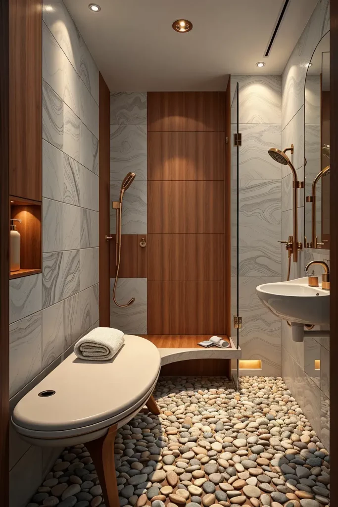 In order to do that, I generally use pebble flooring, curved bench or ledge and oval-shaped decorative items like trays or bowls. I often include a small rainfall showerhead, smooth-shaped fixtures, and cozy wood decorations to create the calm environment. These characteristics enable the bathroom to be functional and yet at the same time feel serene and designer.