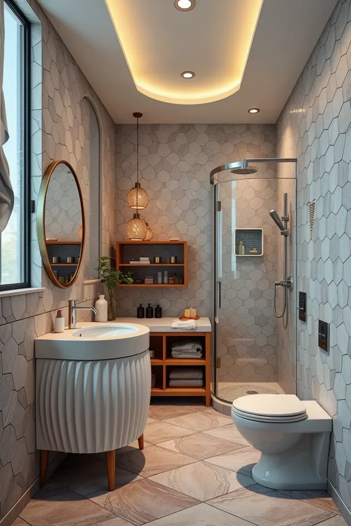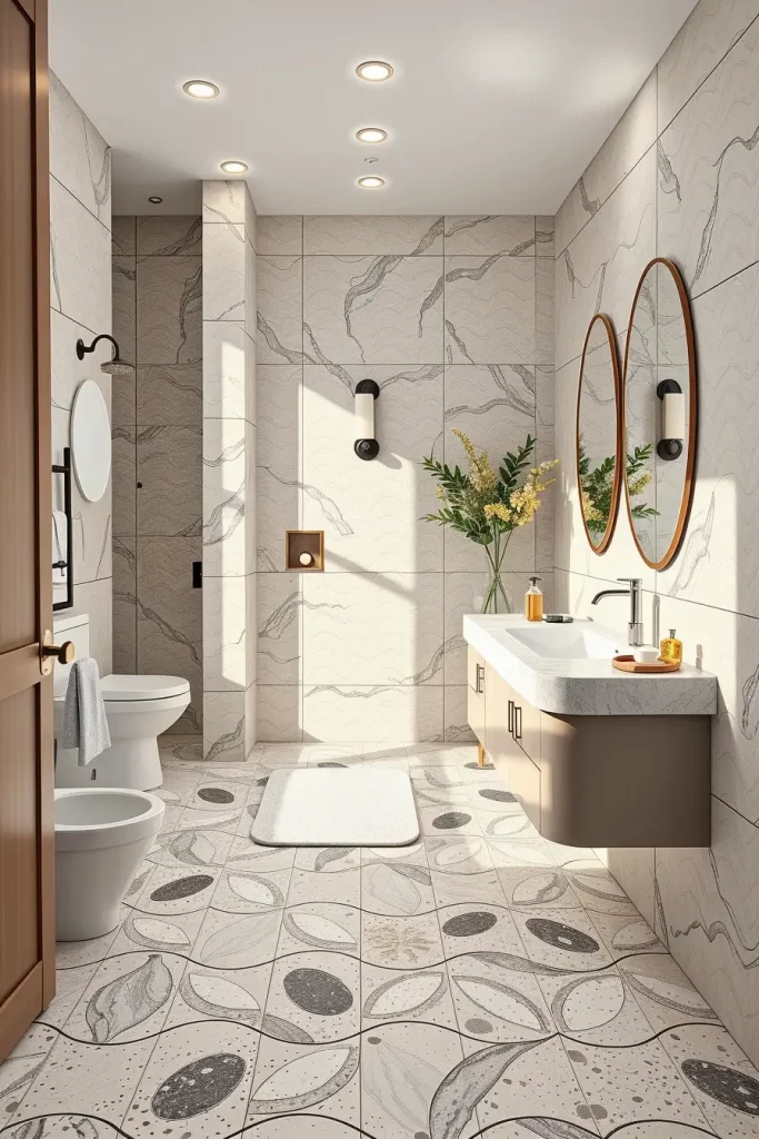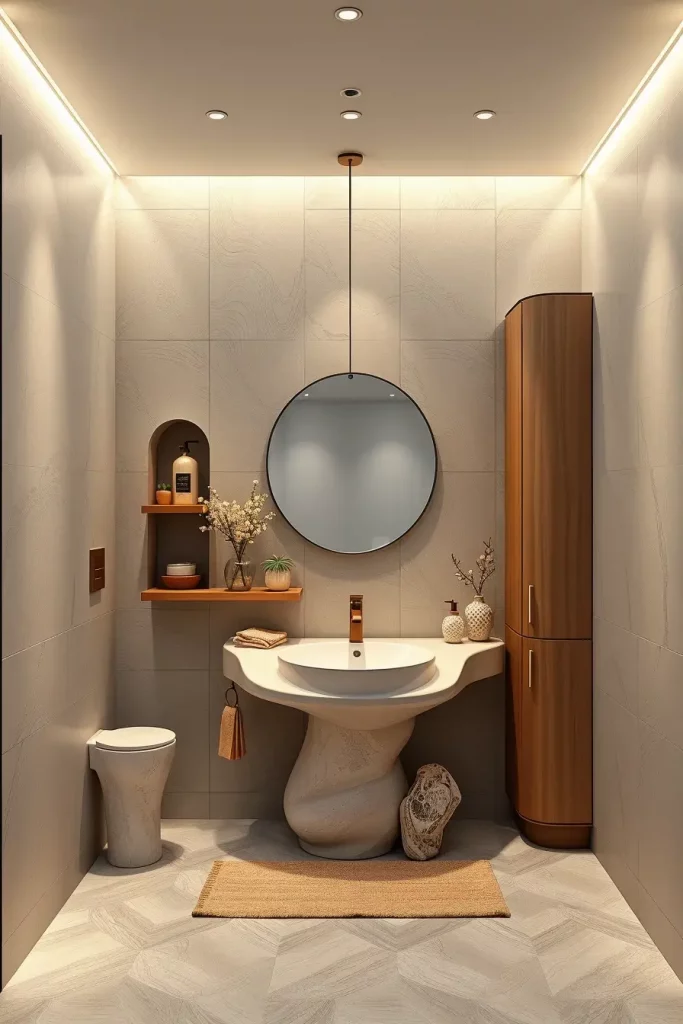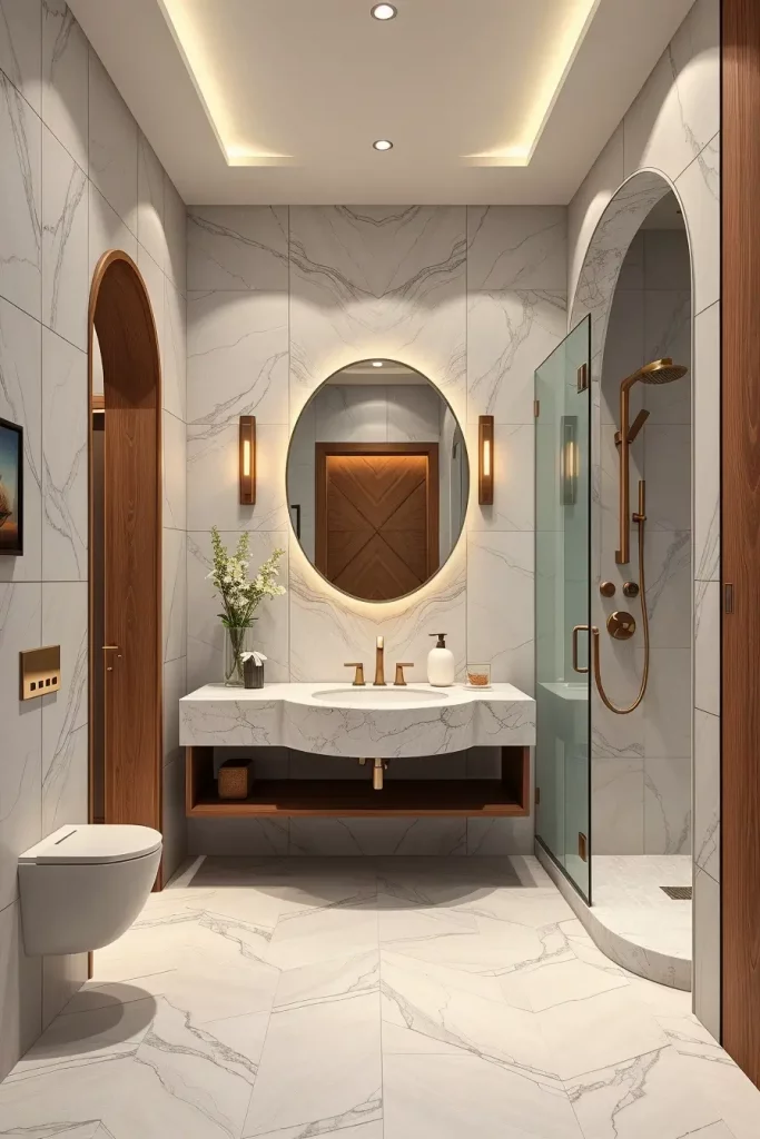 In the layout planning, I select the type of material I would use like terrazzo with oval clusters of stones, curved-gradient tiles that would change tones across the room, or pebble-like flooring to replicate the natural yet designer appearance. The above materials will go well with curved vanities, round-edged cabinetry, and flowing accent walls. I also choose the grout colours properly so that there is a smooth, integrated look in them that contributes to spaciousness.