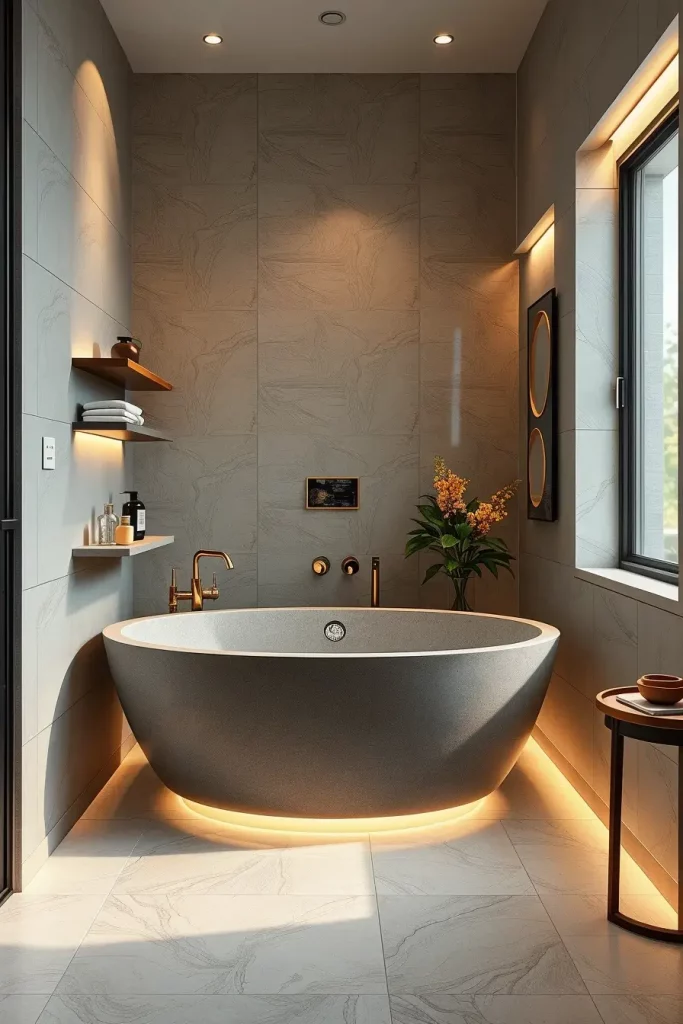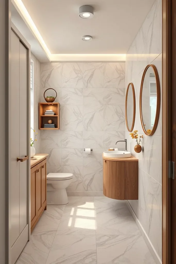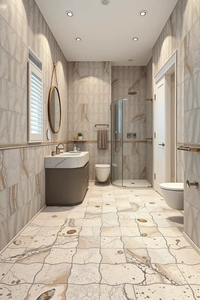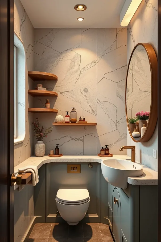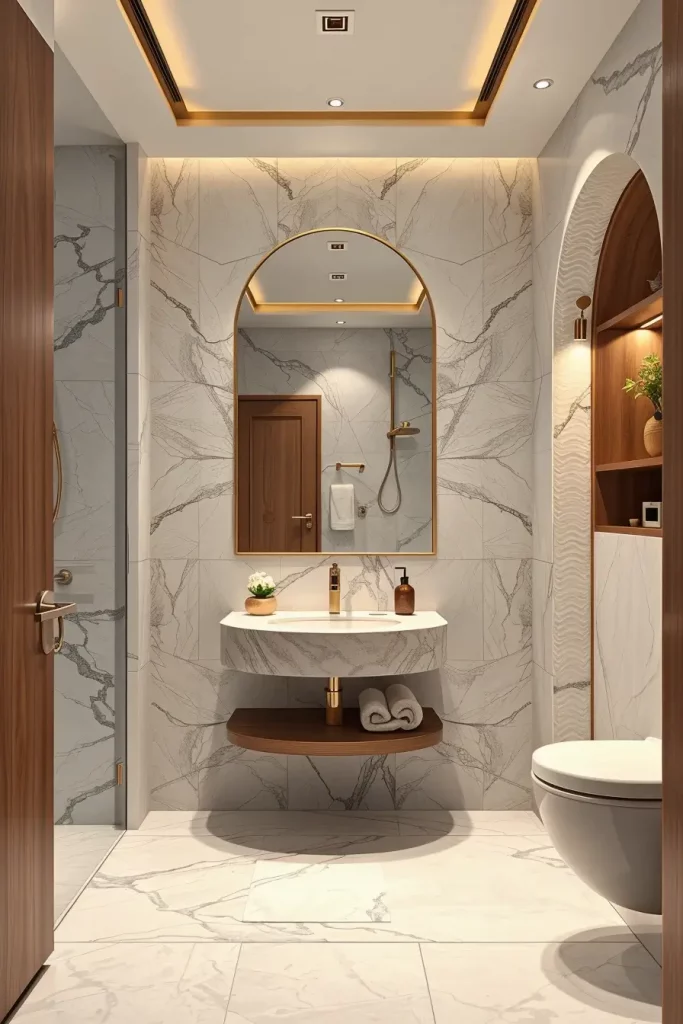 In the layout planning, I select the type of material I would use like terrazzo with oval clusters of stones, curved-gradient tiles that would change tones across the room, or pebble-like flooring to replicate the natural yet designer appearance. The above materials will go well with curved vanities, round-edged cabinetry, and flowing accent walls. I also choose the grout colours properly so that there is a smooth, integrated look in them that contributes to spaciousness.