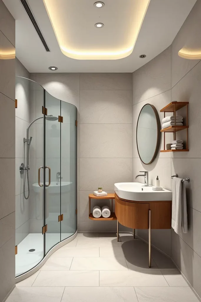 When choosing the fixtures, I would choose the wall-mounted combination fixtures, curved benches doubling up as storage and oval shelves embedded on the shower walls. Such designs minimize the separate elements in the room besides making the room more usable. I also use sculptural-shaped faucets and hardware to add to the unique and curvy nature of the bathroom. All its elements are part of a comfortable but aesthetically pleasing surroundings.