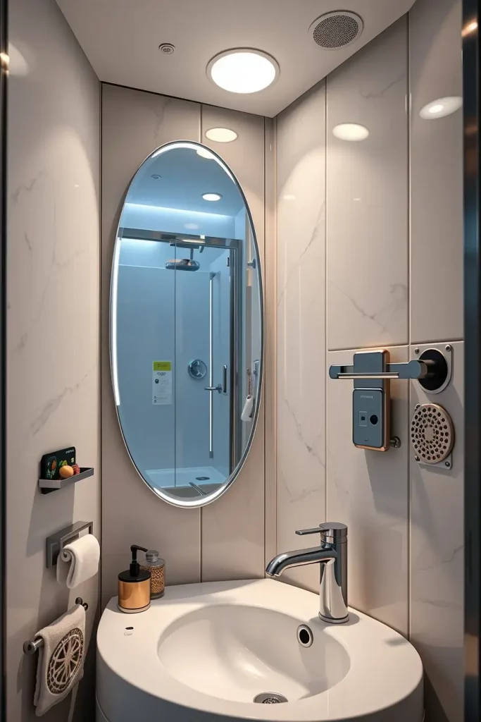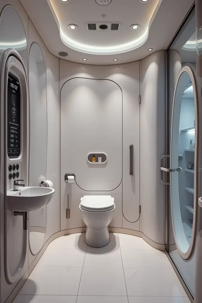My preferences include having wall-mounted toilets, electronic inbuilt-in temperature controllers, and lighting that activates when one moves. I also have designer furniture pieces, which replicate the curvature of the architectural shell, oval storage doors, curved shower partitions, and rounded shelving niches. High aesthetics, as well as safety and movement in the space, are also improved by the lack of sharp edges.