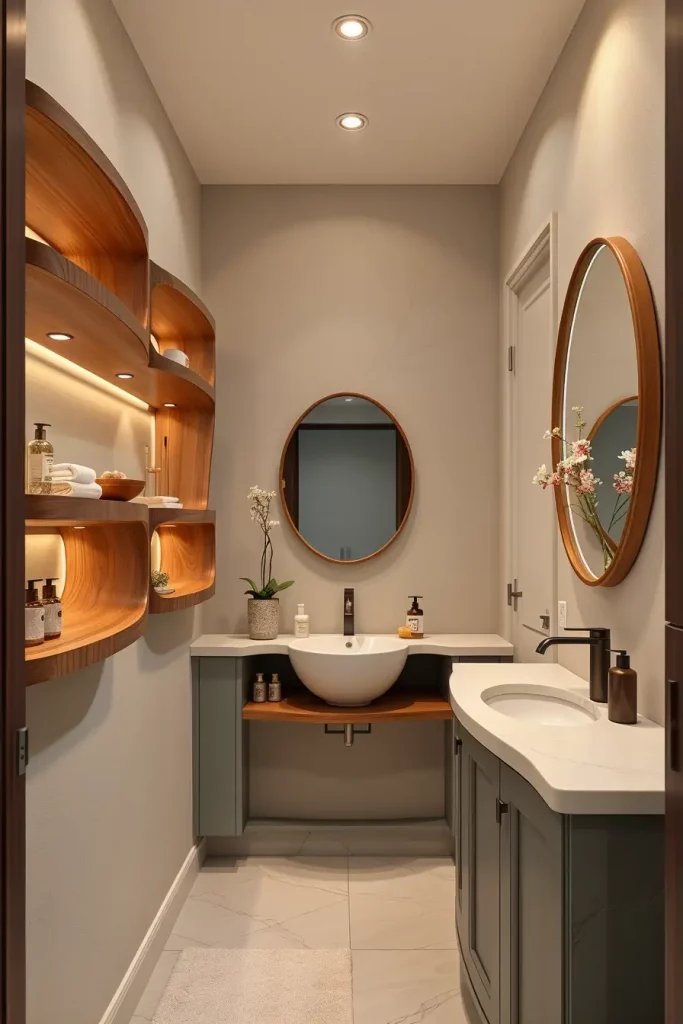 Personally, I am more inclined towards matte stone sinks, porcelain composites, or resin models which can be easily blended into curved vanities. Rhythm is also produced in the layout by the addition of designer furnishings or wall shelves that replicate the oval geometry. Wall-mounted faucets have also been used to ensure the countertop is well organized and sleek, thus creating more utility and freshness.