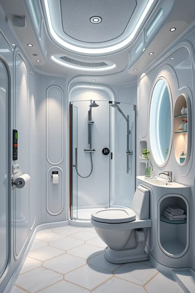 To be even more futuristic, I would include built-in diffusion of scent or customized light settings. These minor elements add the spa ambiance even to the tiniest bathrooms.