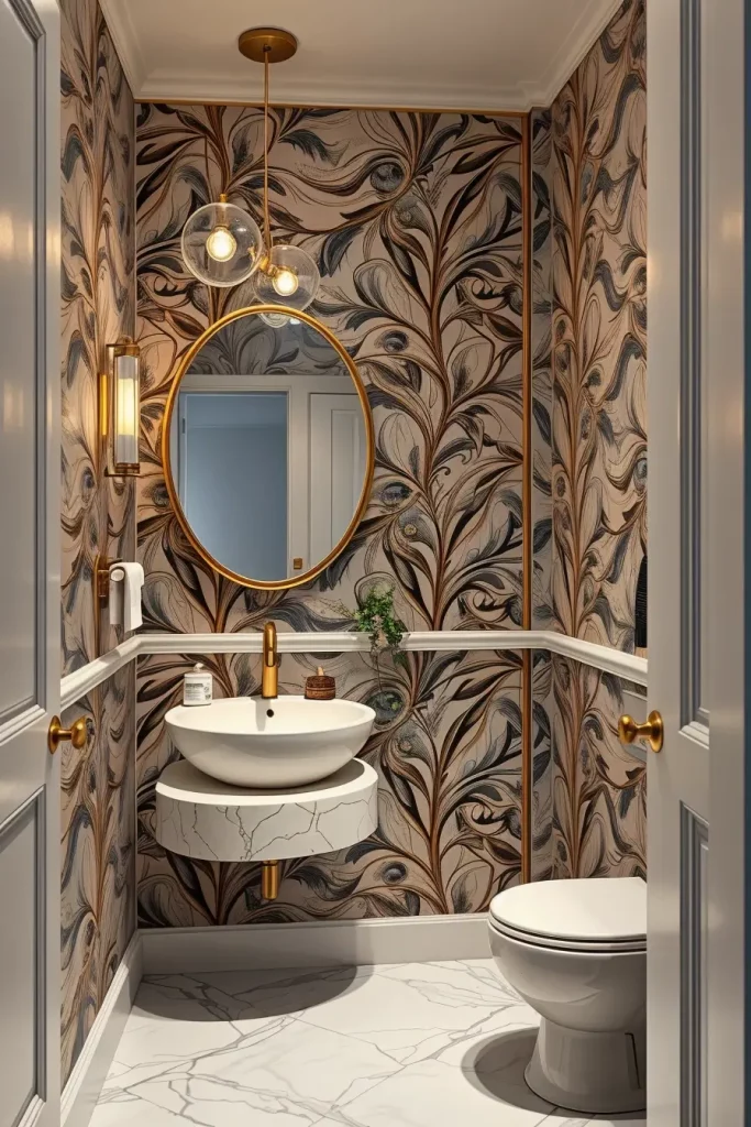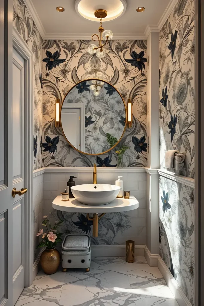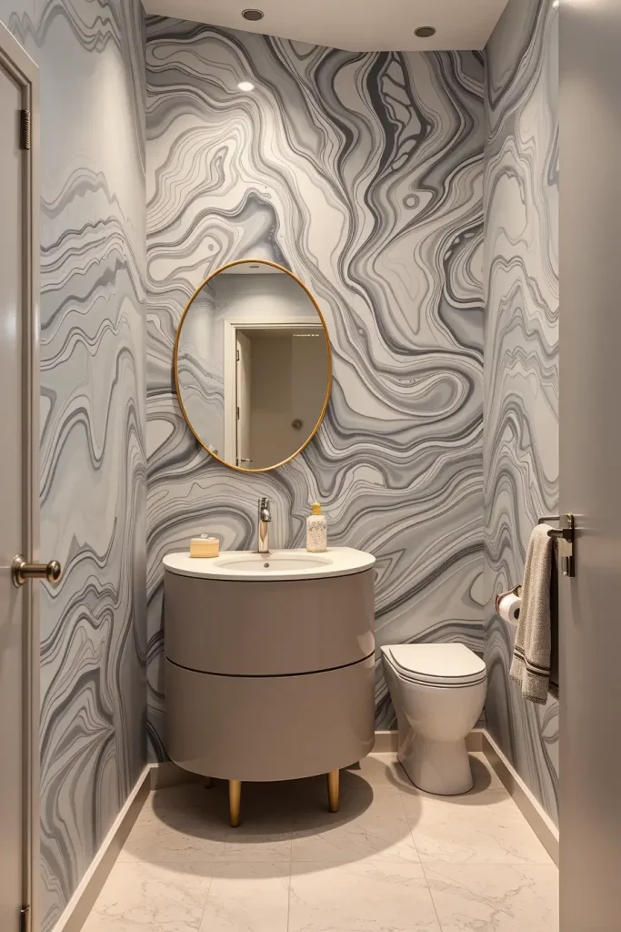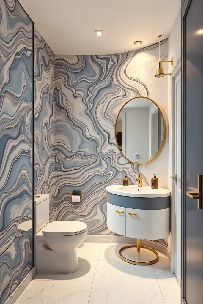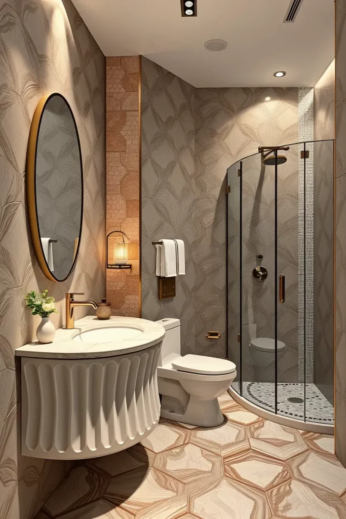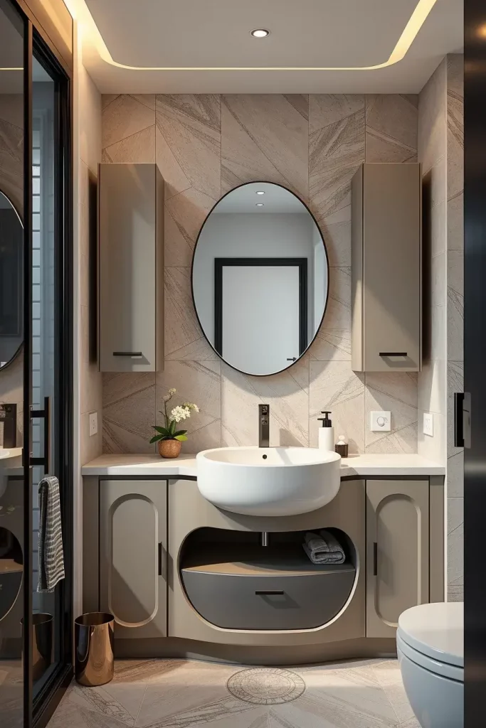The fabrics that I normally use are big size porcelain slabs with wave-like patterns, micro-cement with free craft curves, and moisture-resistant wallpapers with soft oval shapes or organic patterns. These surfaces are appropriate with rounded mirrors, curved sinks, and streamlined cabinets and support the theme of designer, unique, and modern fluidity. Lighting also has a strong impact; the accent lights above or beside the wall makes the pattern even more dramatic.