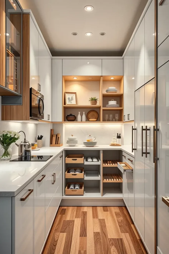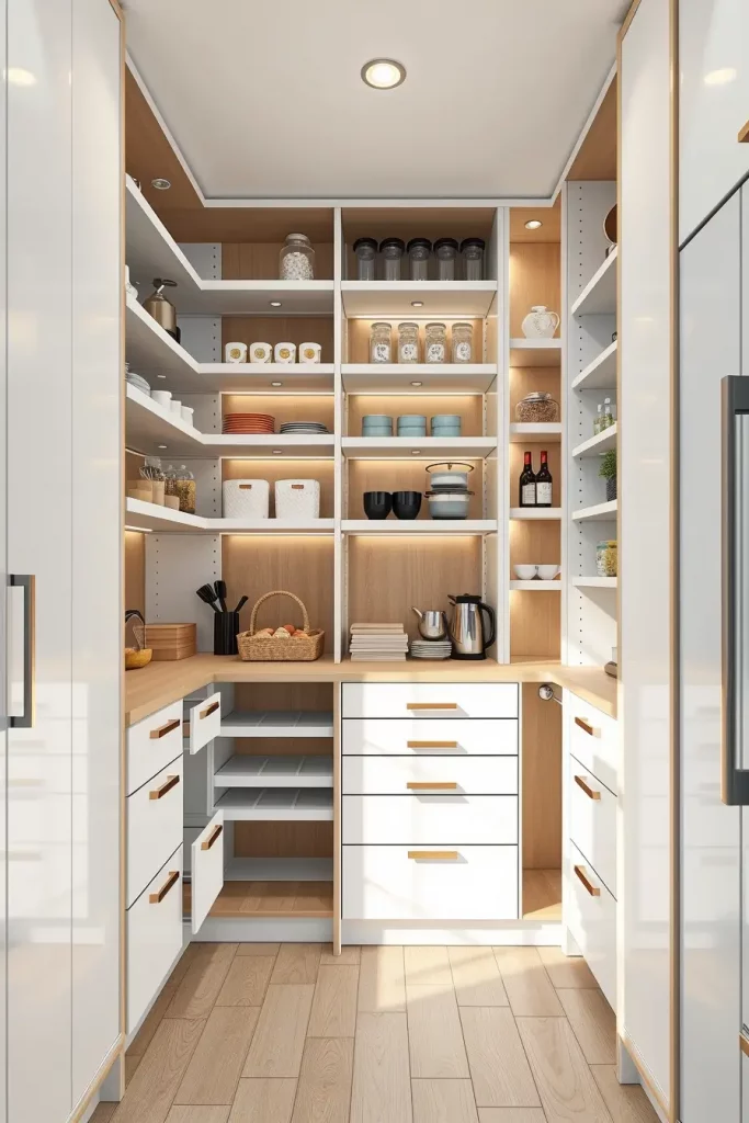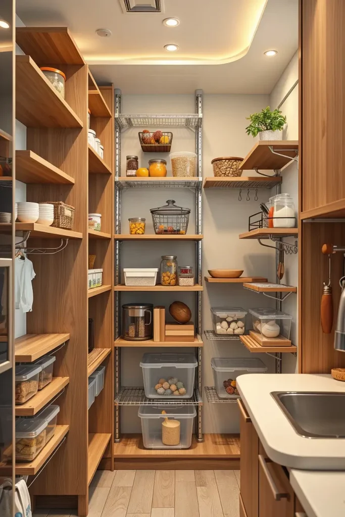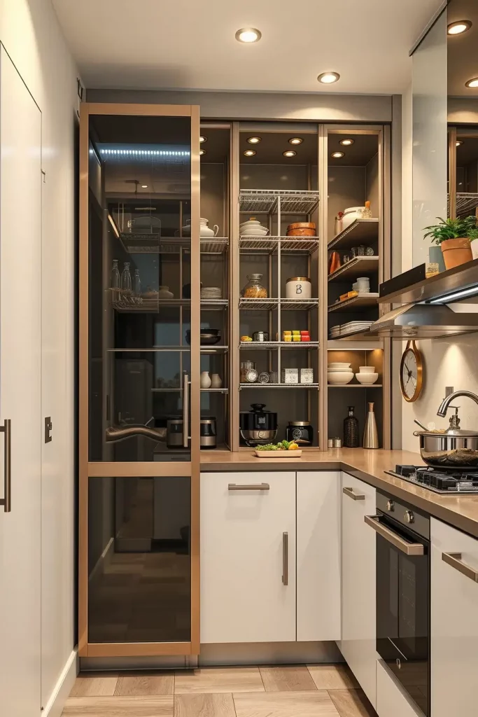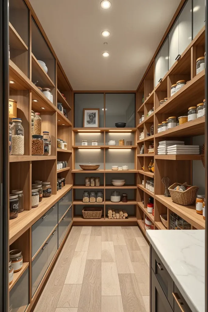 I dwell on the utilisation of vertical storage solutions when designing such spaces, i.e. tall narrow shelving units and adjustable racks. The space is uncluttered with materials such as matte-finish wood or minimalist metal decorations, ensuring the space looks modern. I also add a motion sensor LED lighting in the pantry to increase the visibility and ease especially in low-light kitchens.