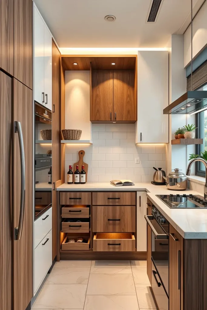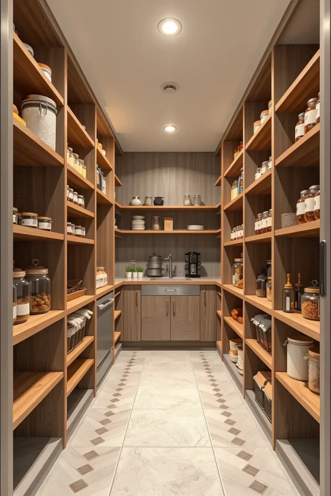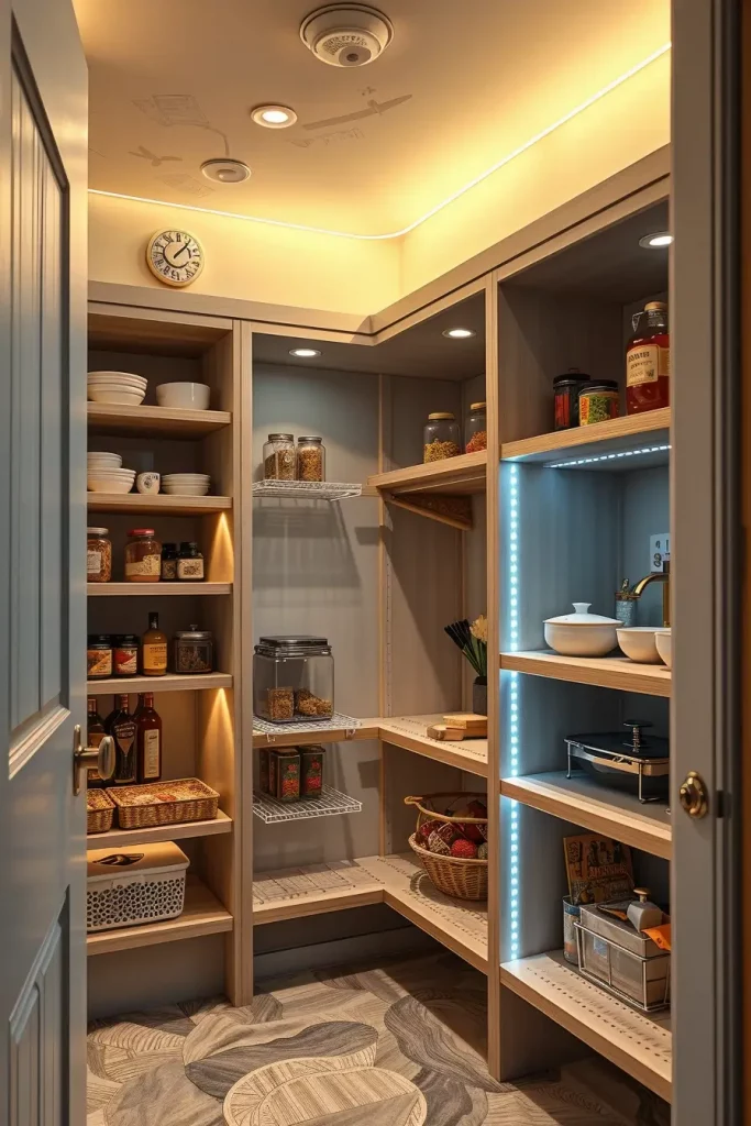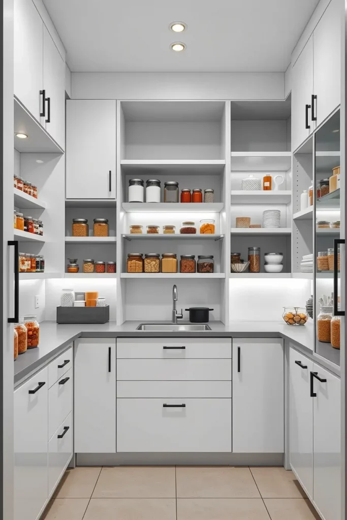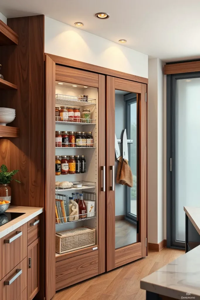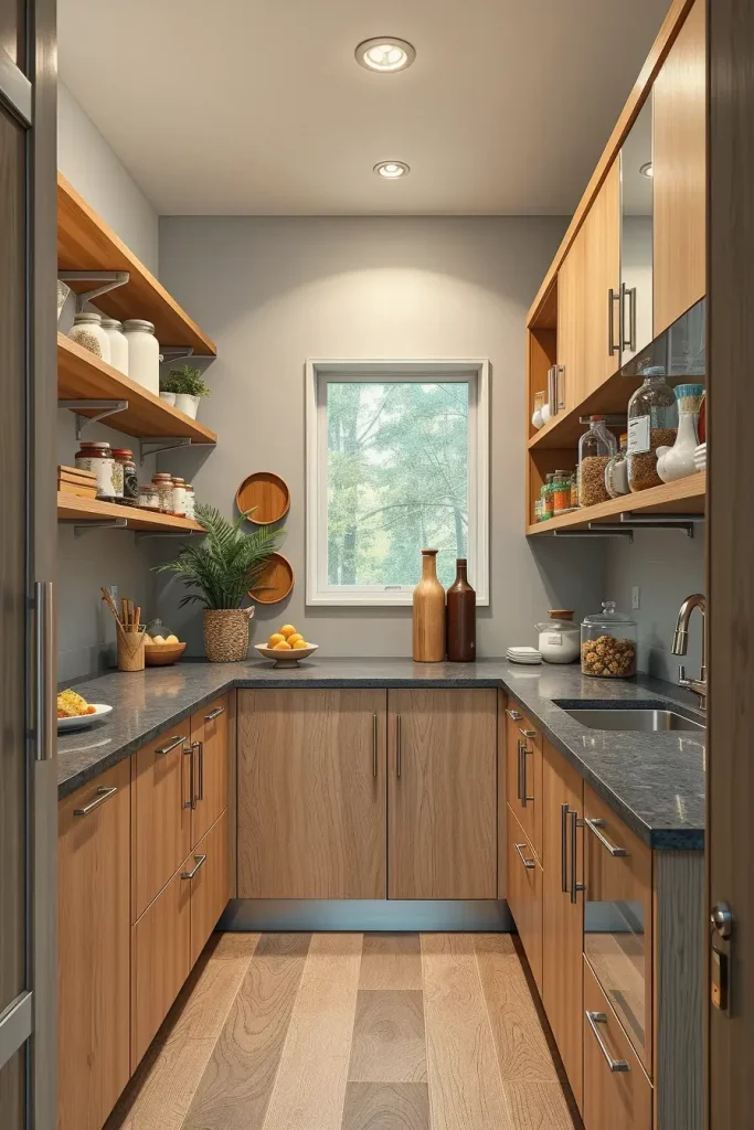 I dwell on the utilisation of vertical storage solutions when designing such spaces, i.e. tall narrow shelving units and adjustable racks. The space is uncluttered with materials such as matte-finish wood or minimalist metal decorations, ensuring the space looks modern. I also add a motion sensor LED lighting in the pantry to increase the visibility and ease especially in low-light kitchens.