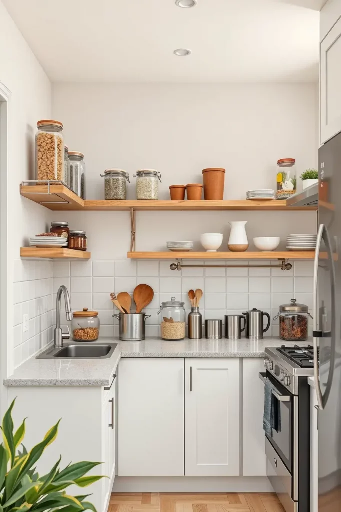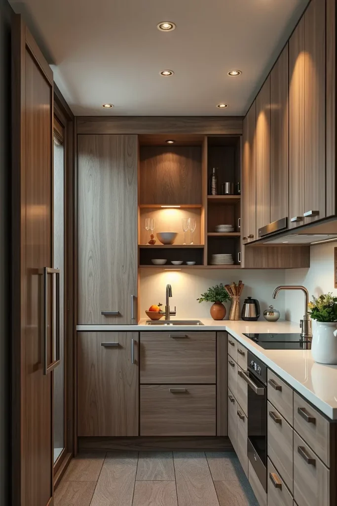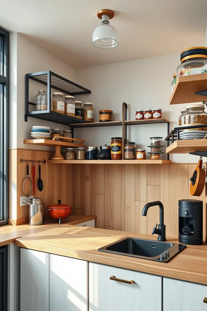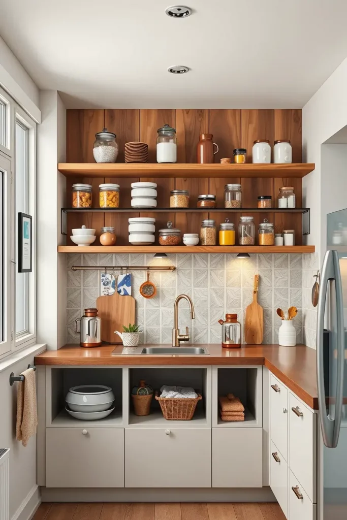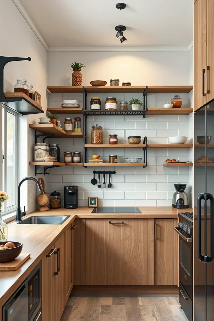 I would suggest that adjustable open shelves are paired with pull-out baskets or stackable bins. Such a combination offers accessibility and order. Such materials as oak veneer or matte black metal will provide a balance between functionality and design, which will add sophistication to small kitchens.