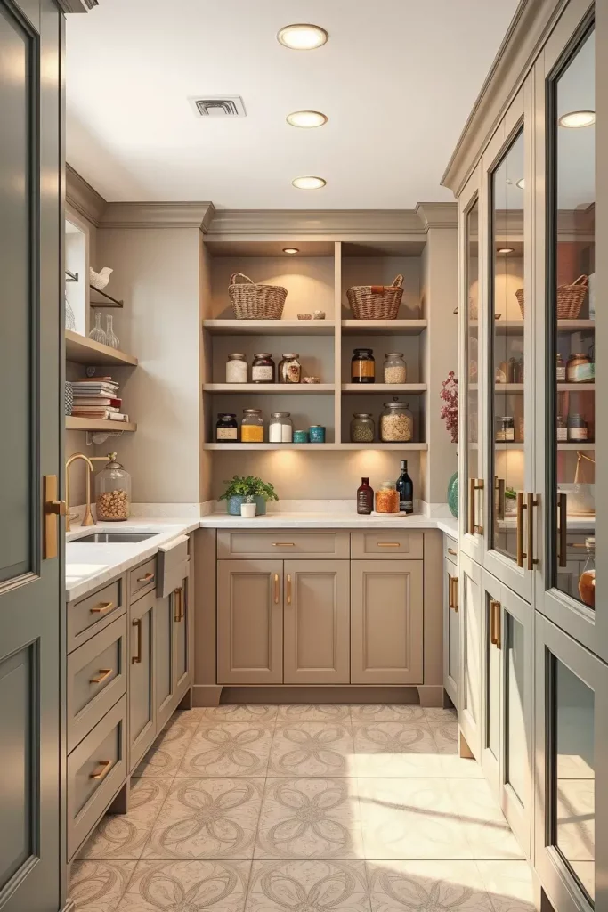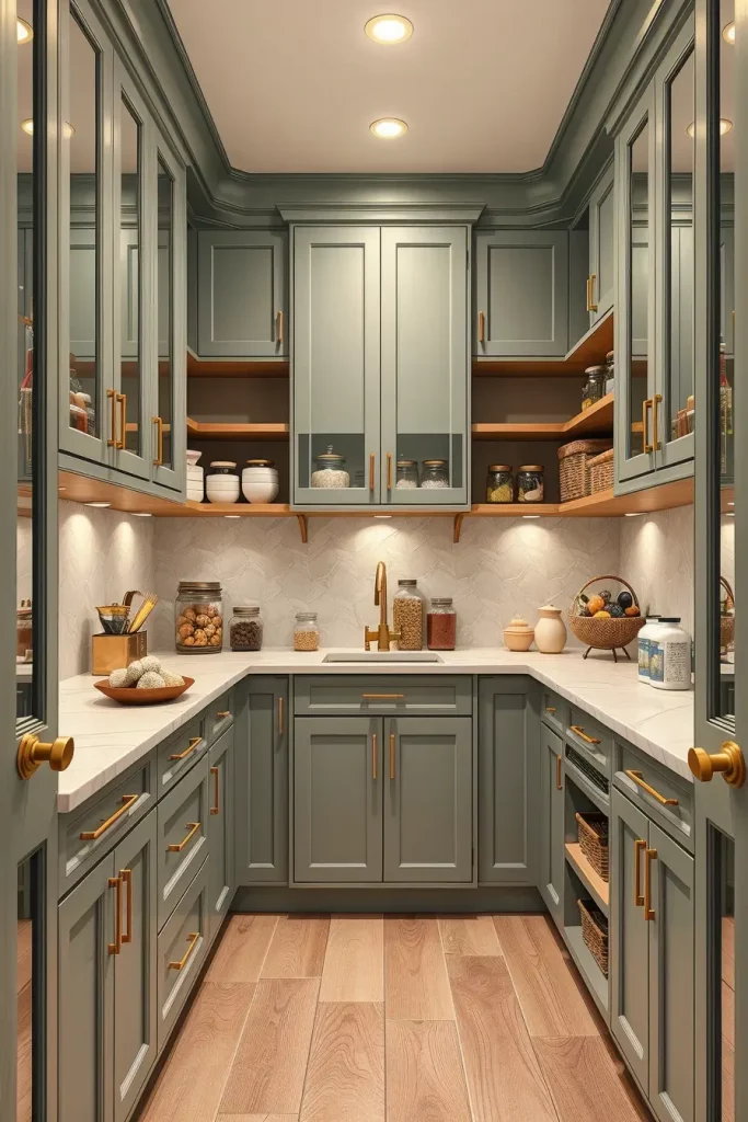 Light-reflective surfaces in my career experience make small spaces appear larger. Architectural Digest claims that in 2026 the kitchens and pantries will shift toward a more natural color scheme that bridges the gap between the warmth of nature and the coldness of the minimalist design. I totally concur with this since these colors render a pantry functional and approachable.