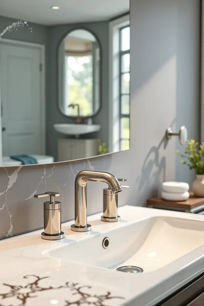 In sinks, I prefer single handle sinks because they are easy to control the temperature and avoid wastage of water. The finishes such as brushed nickel or chrome give a modern feel and are water spot resistant. I would also recommend models that have ceramic disc valves to prevent dripping and long-lasting.