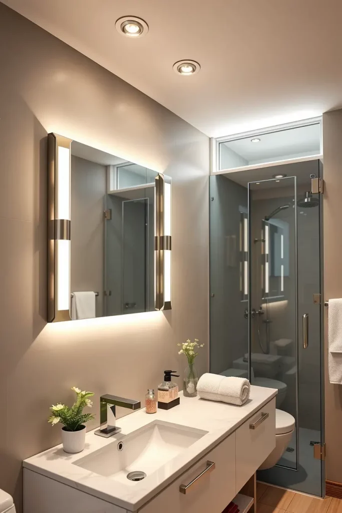 To complete this section, I would suggest built-in lighting in the vanities or shelving to give a sleek appearance and to emphasize the most important places without the introduction of additional fixtures.