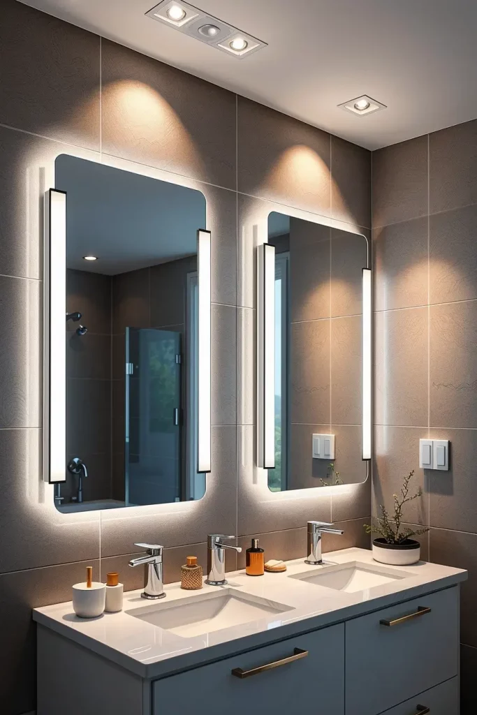 When the fixtures are on the ceiling, I prefer fixtures that have dimmers to allow users to regulate the intensity of the lights. Vertical sconces at eye level are the best way to provide task lighting around mirrors to minimize shadows. Such finishes as brushed aluminum or matte black can be used perfectly in contemporary eco-friendly design.