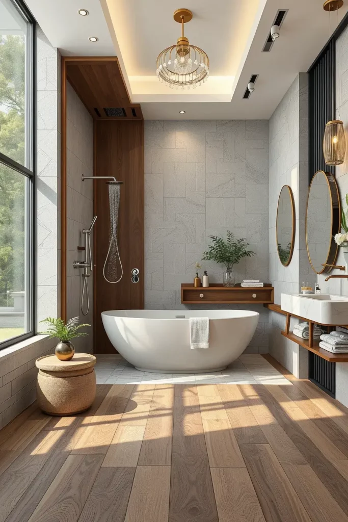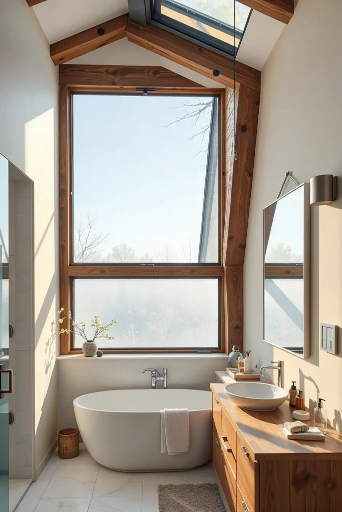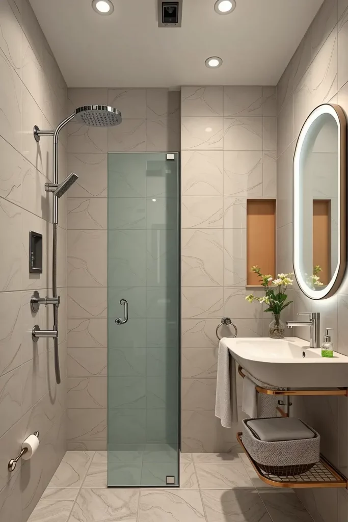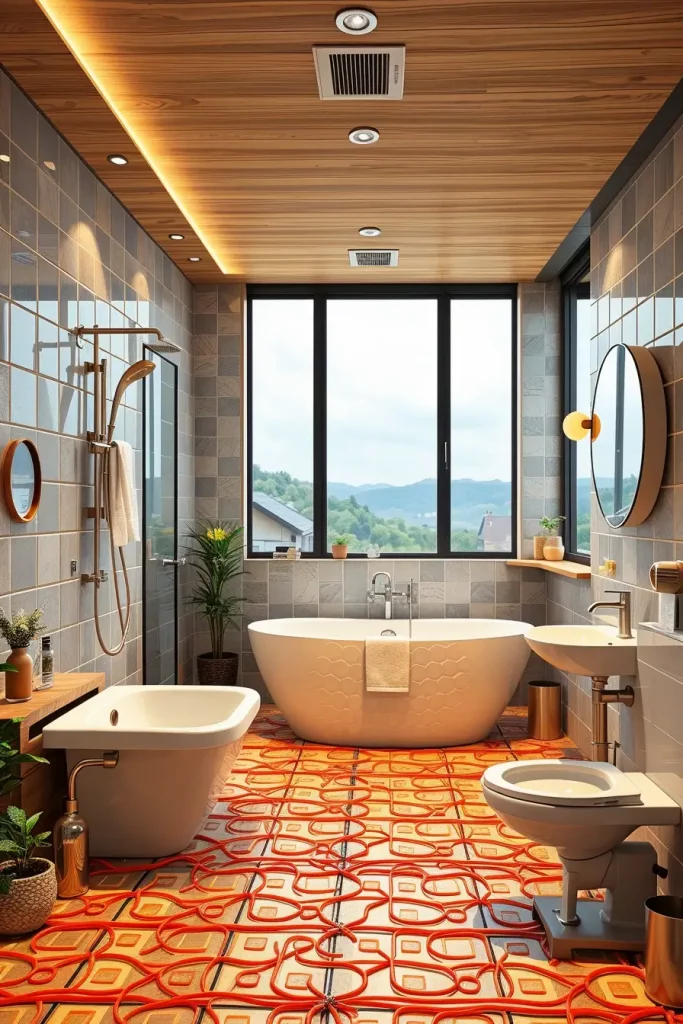 I would also incorporate radiant floor heating under the tiles to be efficient since it consumes less energy compared to the traditional heating systems and maintains the bathroom warm and comfortable.