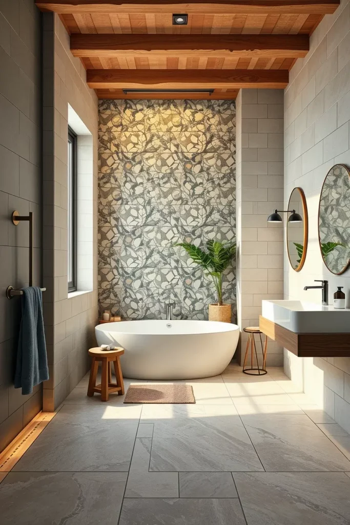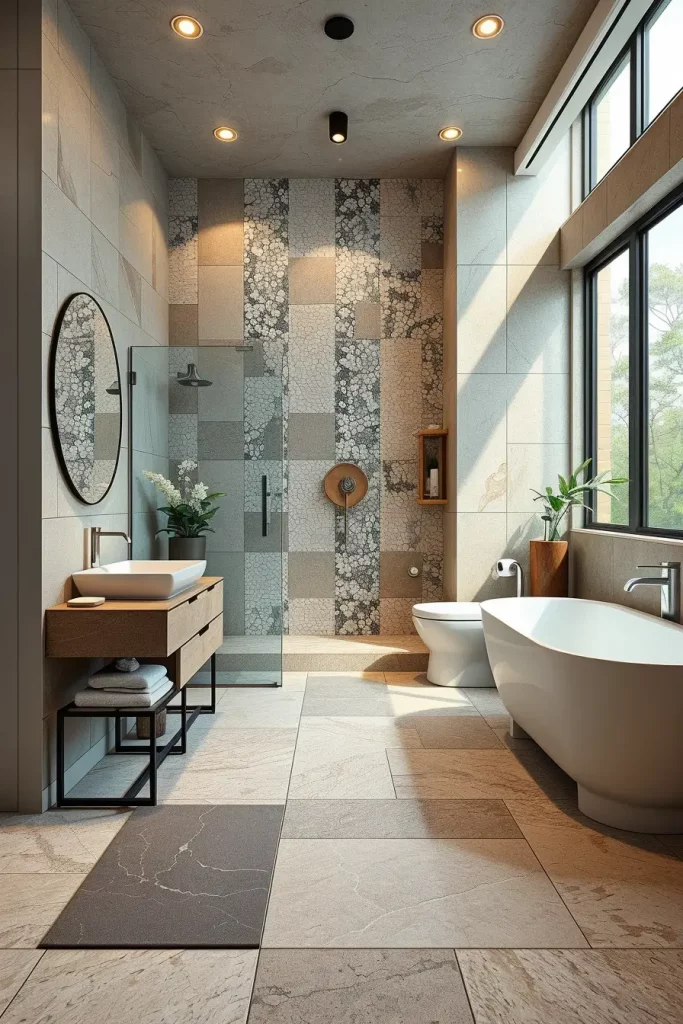 To cover the floor and walls, I would choose large-format tiles that would have minimal grout lines to make cleaning easier and lessen the use of harsh chemical cleaners. I tend to suggest the patterns that are calming, like light neutral colors or natural stone finishes. The decision to use local tile suppliers will also reduce transportation emissions, which is in line with environmentally friendly objectives.