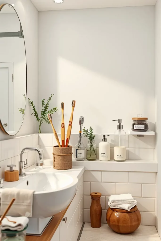 I suggest solid shampoo and conditioner bars, bamboo toothbrushes, and refillable glass or metal dispensers of liquid soap and lotions. Glass jars, ceramic containers, or metal tins can be used instead of plastic baskets and bottles in order to store them. This is not only more aesthetically pleasing but also helps to lead a more environmentally friendly life.