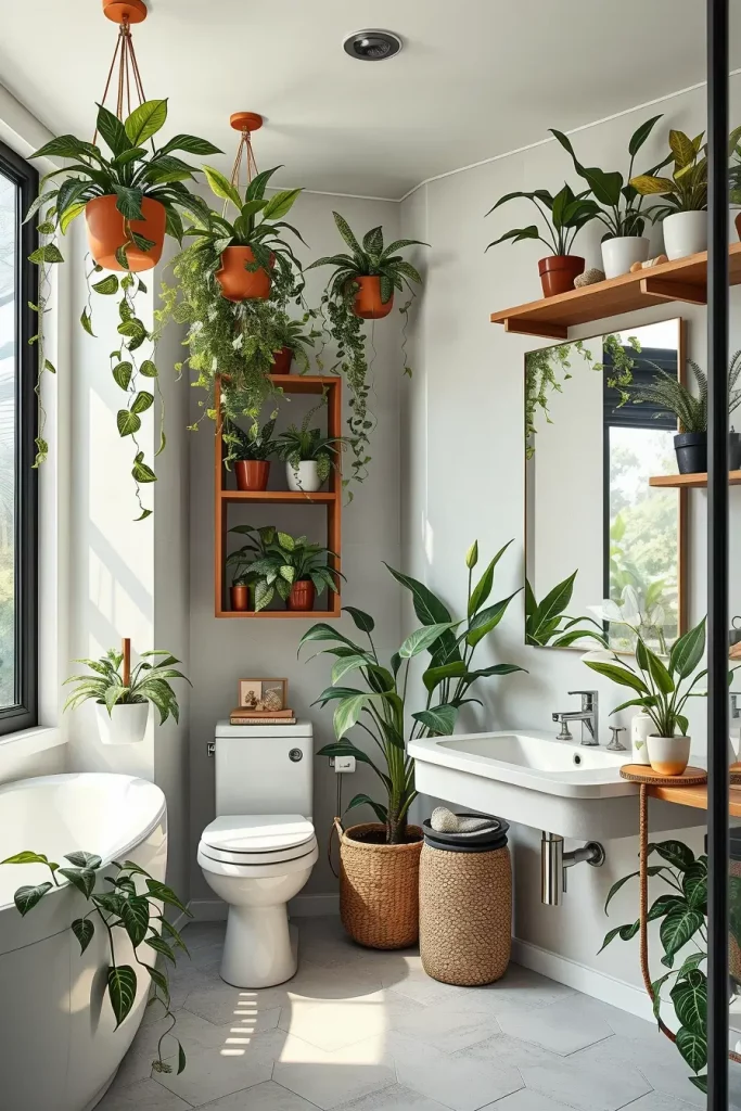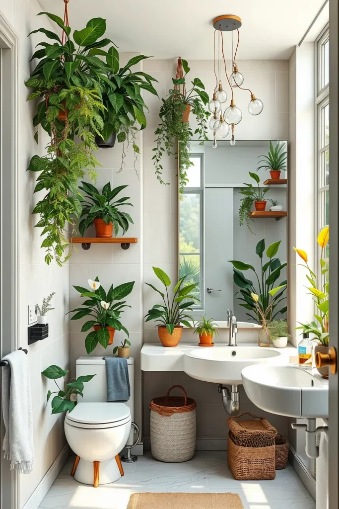 I tend to use hanging planters, wall-mounted pots or shelving displays to have plants off the wet surfaces but still incorporate greenery into the design. The plants purify the air by taking up the toxins in the air and giving out oxygen, making the area fresher and more comfortable.