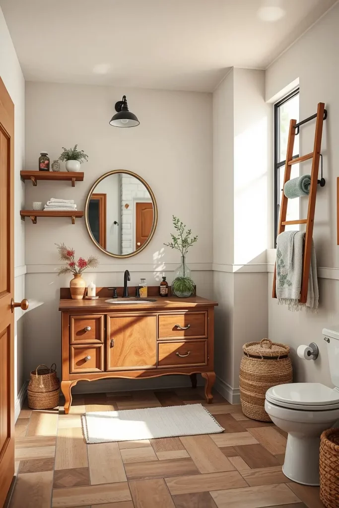 I prefer solid wood furniture most of the time since they can be sanded, refinished and sealed to be used in the bathroom. This does not only save money but also prevents the disposal of good pieces in landfills. Simple, but effective ideas are to add reclaimed shelving or use an old ladder to store towels.
