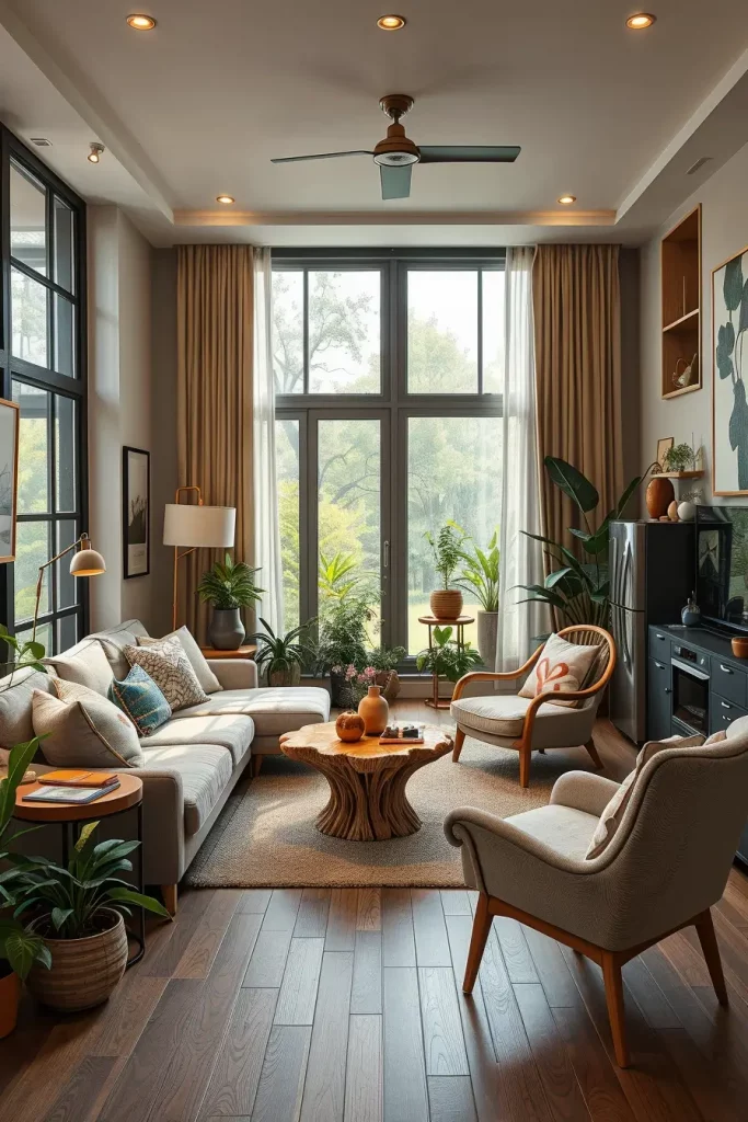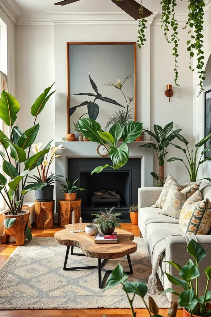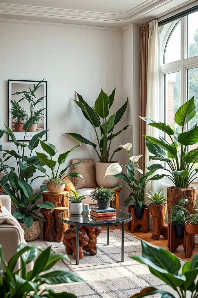 I tend to incorporate plants that require minimal care such as snake plants, pothos, and peace lilies in my designs. They are indoor plants that do not need many resources. Bigger plants such as fiddle-leaf figs or palms are great statement pieces in living rooms, providing both height and texture.