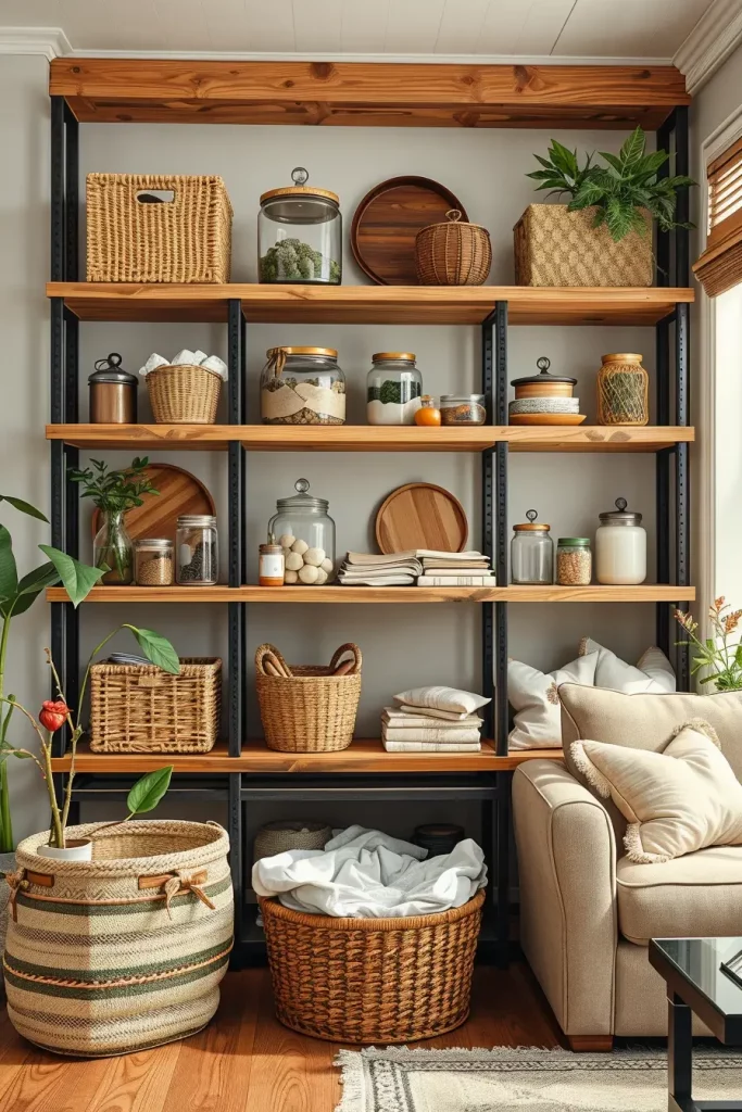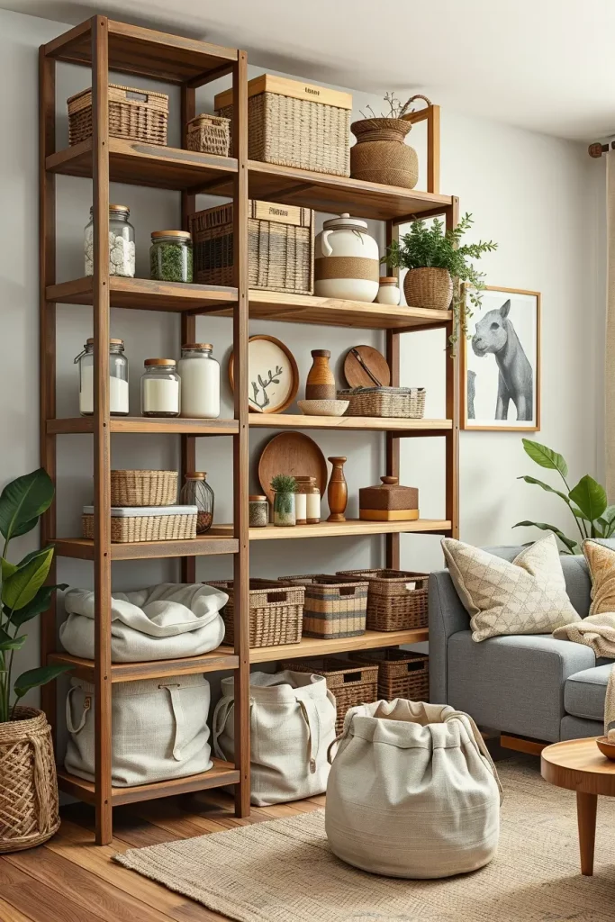 I tend to recommend glass jars, bamboo baskets, and recycled metal bins to store. Shelf units constructed using reclaimed wood are stylish and useful. I also prefer to use fabric bins that are made of organic cotton to store soft items in bedrooms or living rooms.