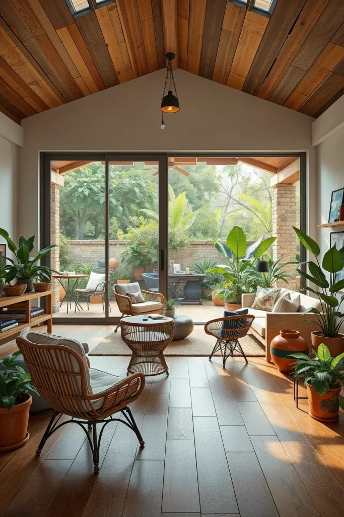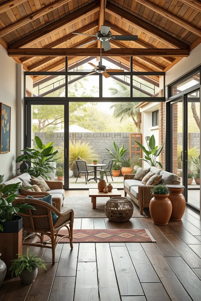 Smooth transitions between the indoor and outdoor environment are one of the most effective sustainable home interior decorating concepts. The lines between the two are blurred by large glass doors, reclaimed wood flooring that leads to a patio, and indoor plants. This maximises natural light and also minimises artificial cooling or heating when designed well.