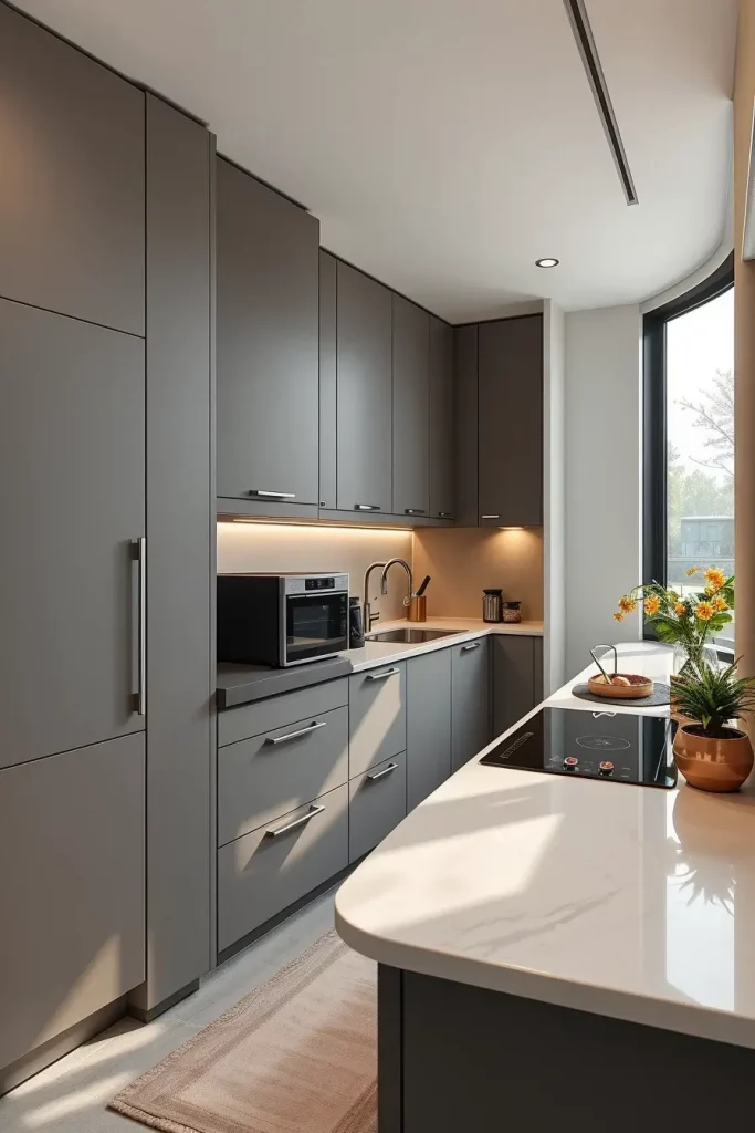 I use slim countertops, smoothbuilt integrated storage and narrow appliances to ensure a clean appearance. The layout is efficient and well-organized with space-saving factors like under-counter refrigeration, induction cooktops, and high-reaching upper cabinets. I usually prefer using sliding doors rather than swing-out doors that may cause obstruction in a cabinet and I use neutral colors to coordinate the space aesthetically. The details are used to maintain a clean kitchen and make it practical.
