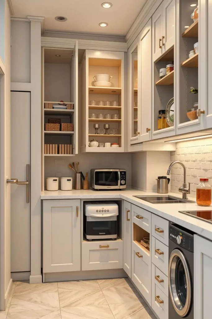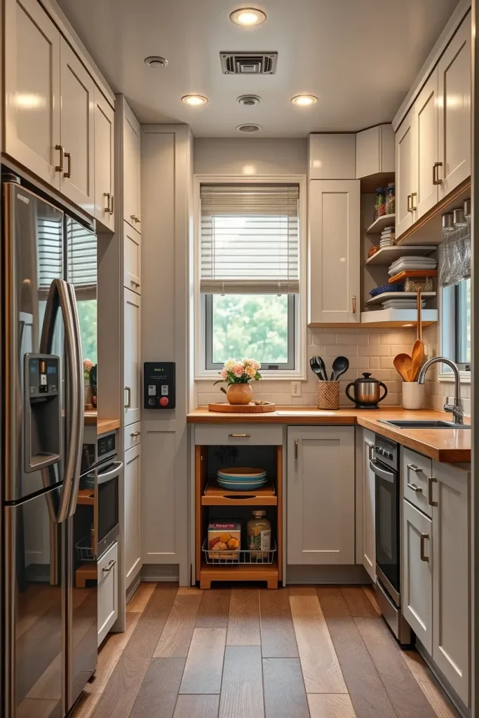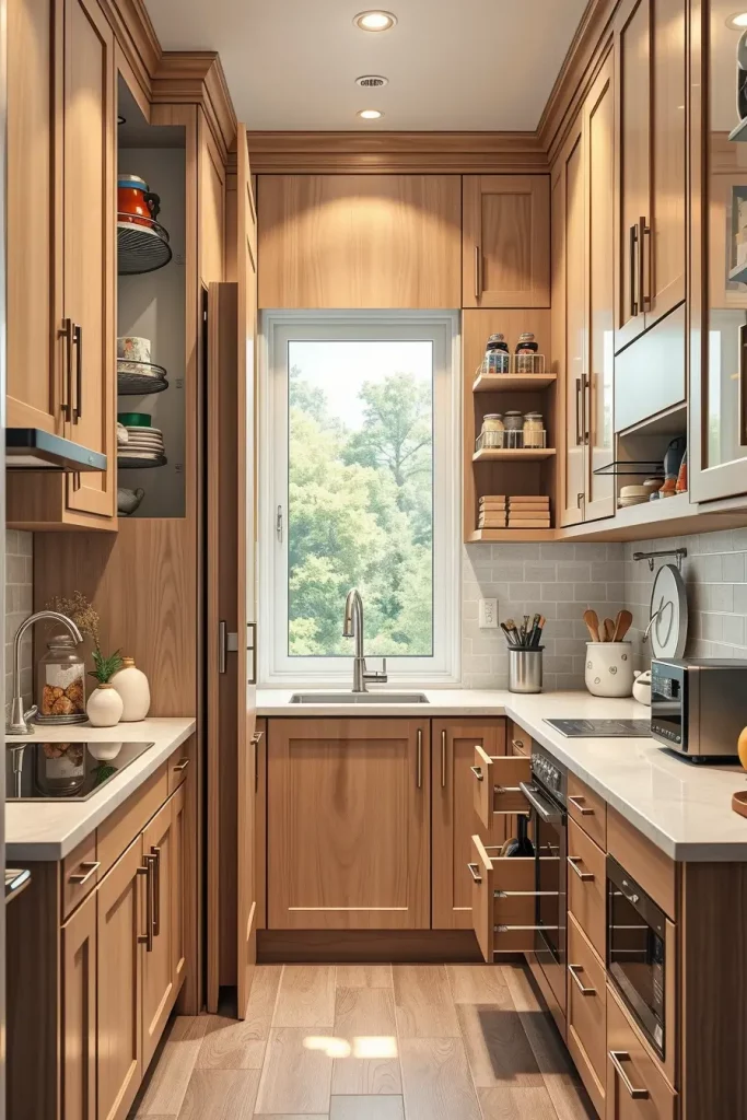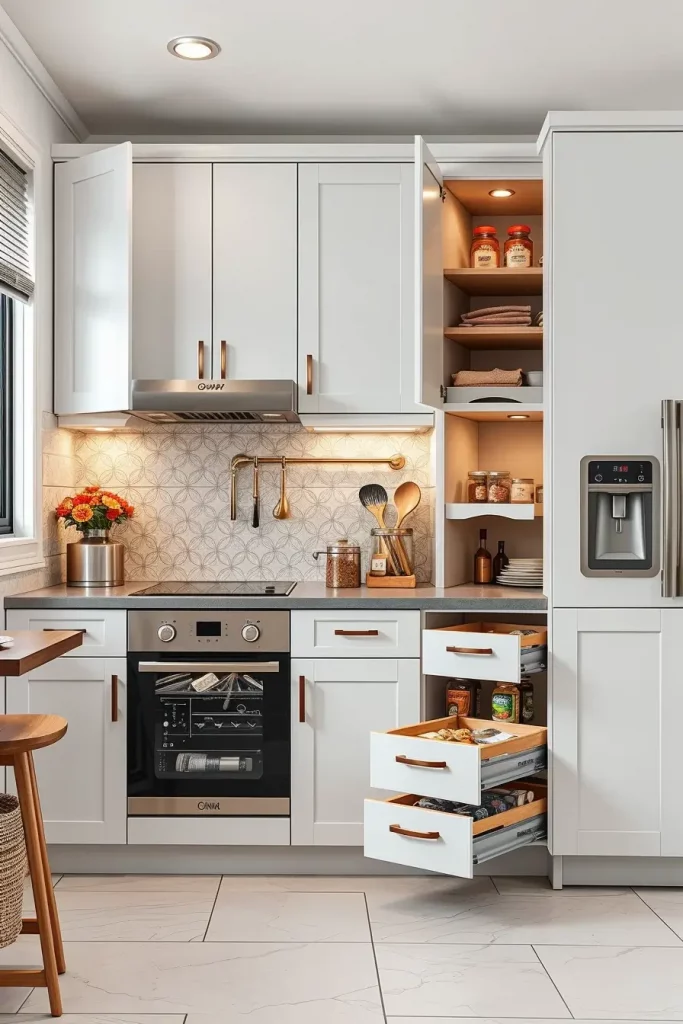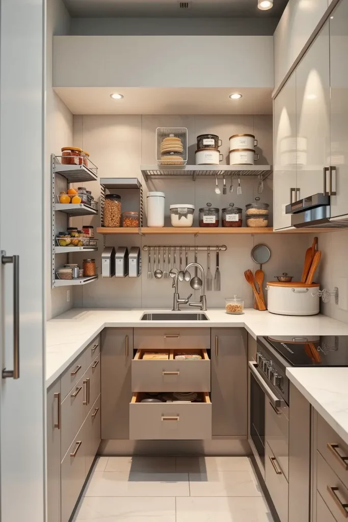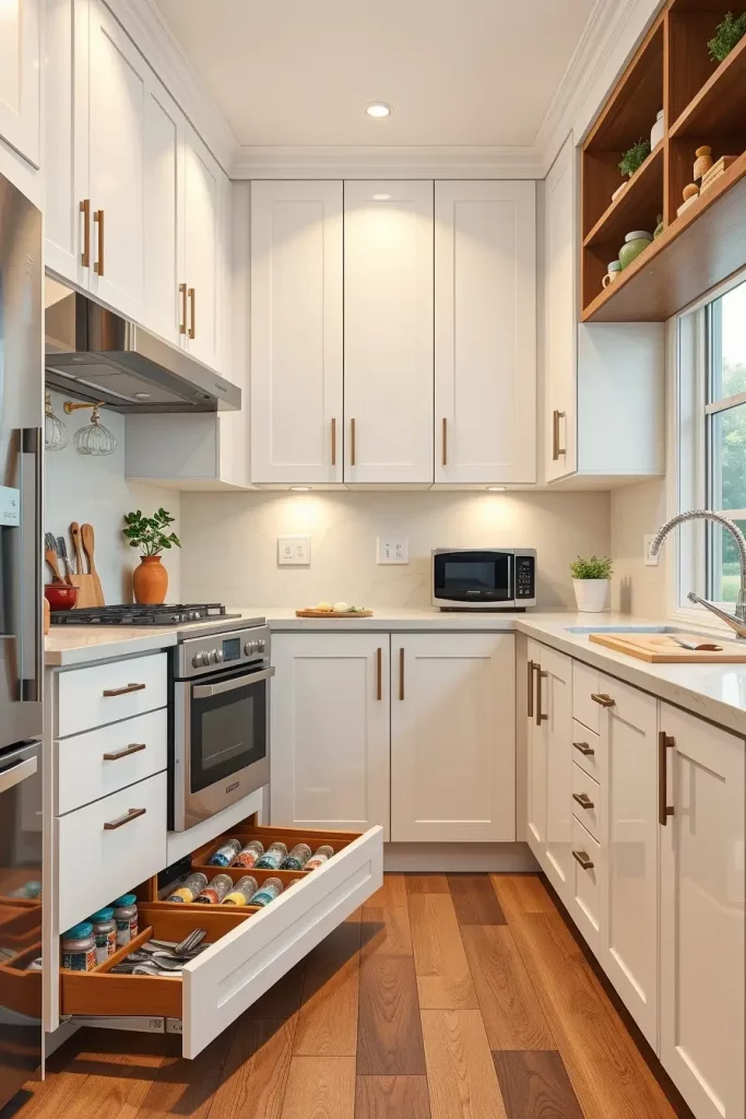 In the case of the furniture and built in objects, I would add narrow drawer towers, under sink organizer, magnetic knife panel, and multi section utensil dividers. The features make things available and orderly at the same time. I will tend to add shallow shelves and small appliance garages to make sure that there is no clutter on the countertops. Wall mounted racks also assist in maximizing the surface area which is limited.