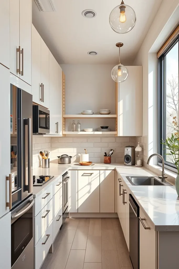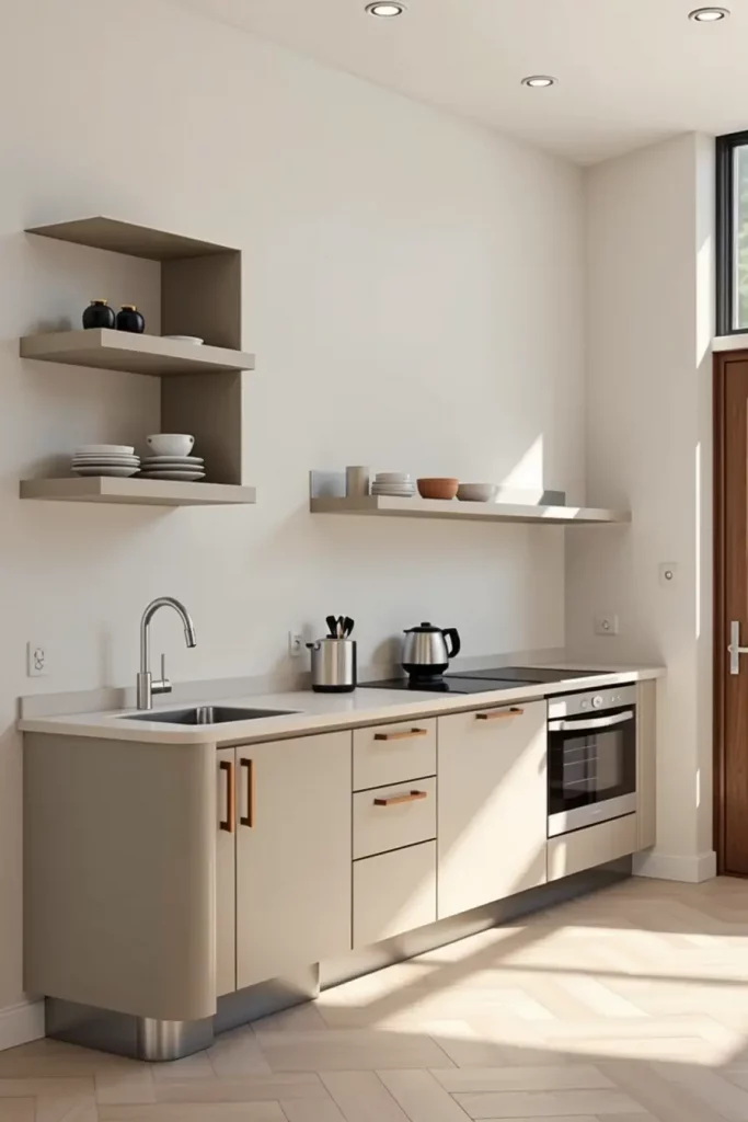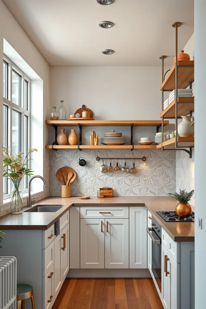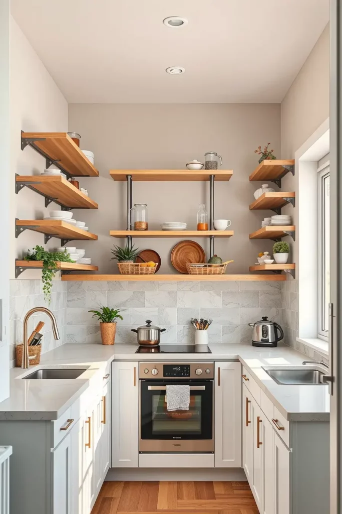 Open shelving is also one of my products that I prefer to use in order to make a small kitchen look airy in 2026. This is because I open up the room by taking away the upper cabinets in some points and instead using floating shelves to enable free flow of light into the space. This makes it lighter and creates the effect of a broader and more open space. I usually have the shelving combined with lighting positioned appropriately.