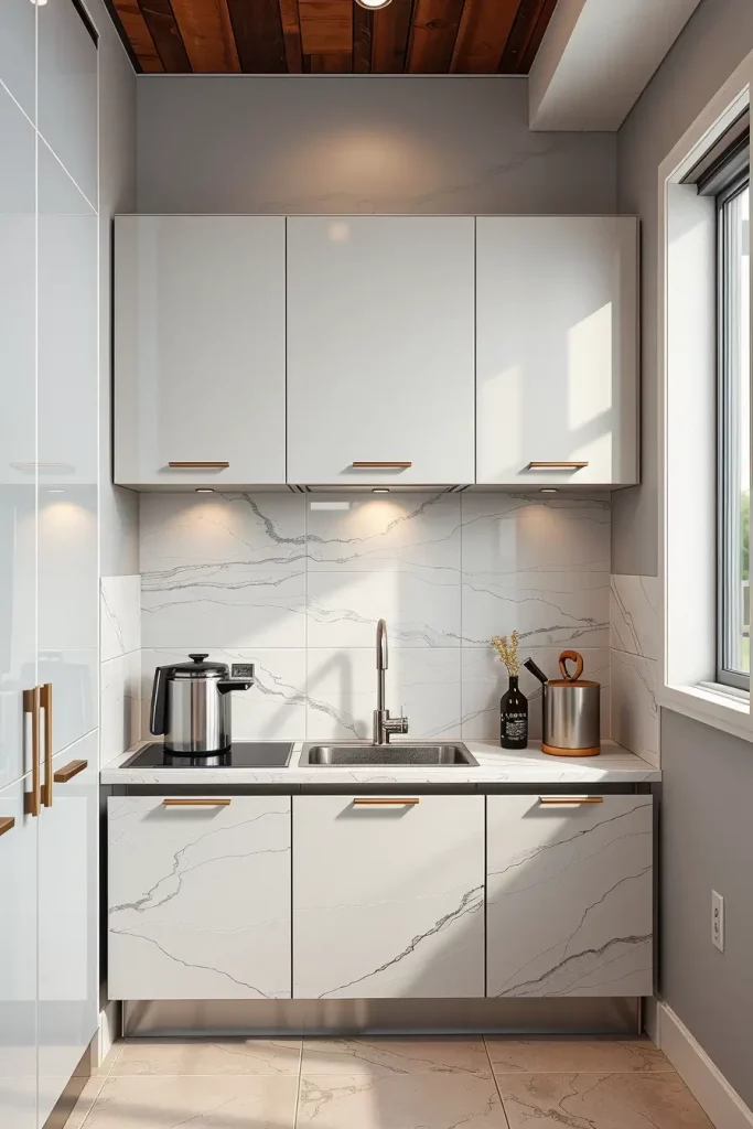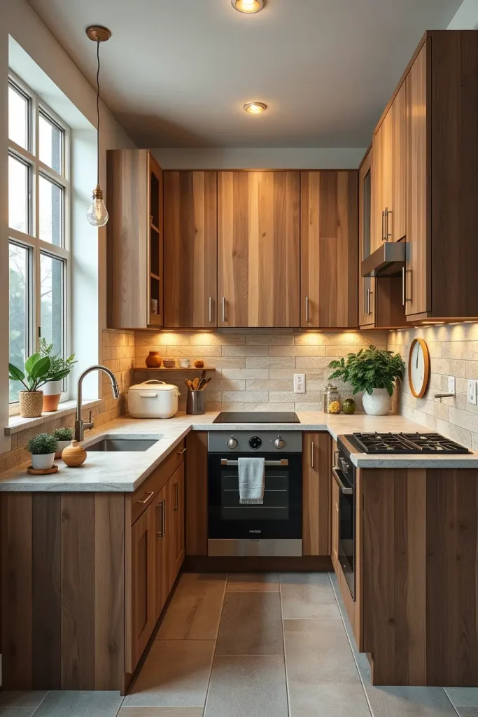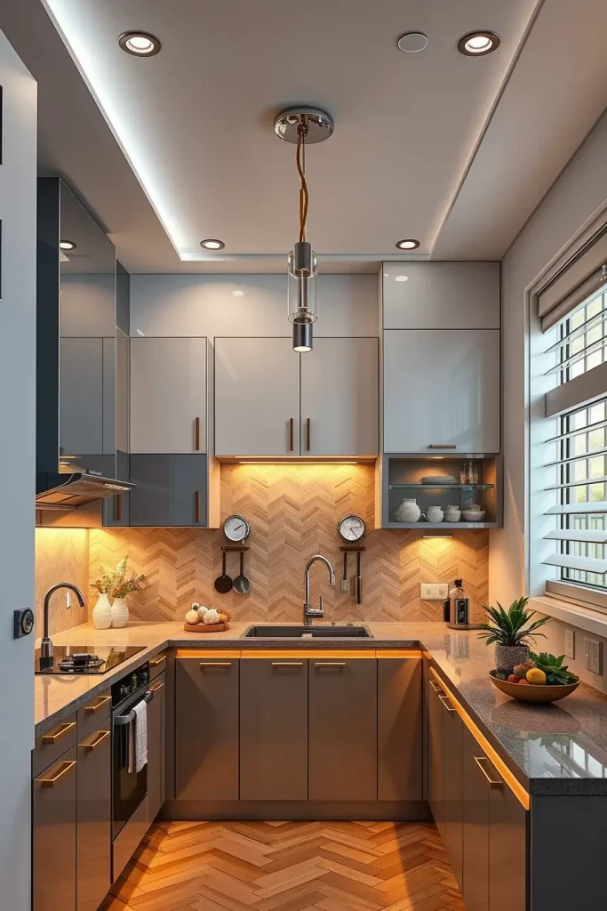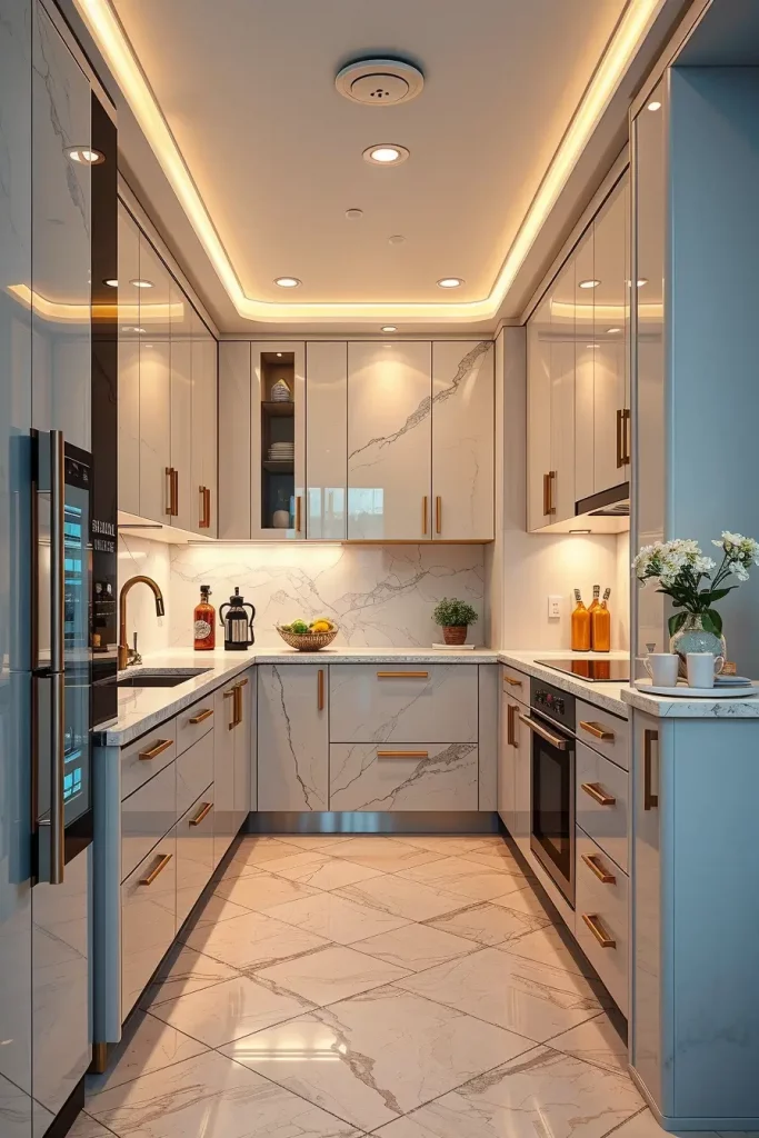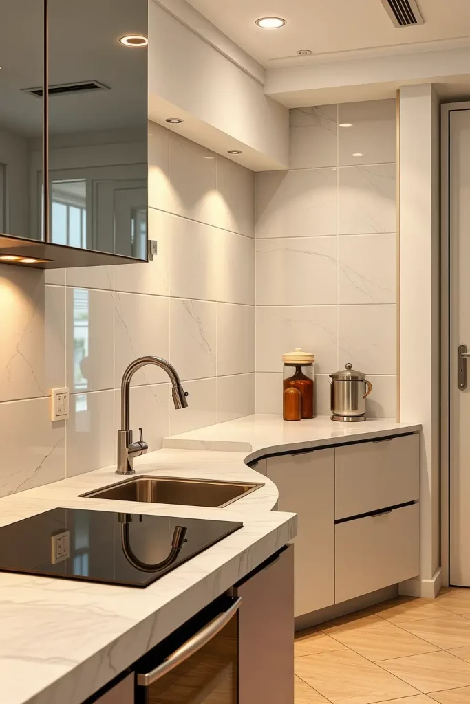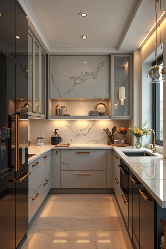 The most common materials I use to achieve a polished impression are marble-look quartz, brushed brass hardware or a slightly bumpy cabinetry. The upscale atmosphere is made with a sleek backsplash that has soft veining, built-in appliances, and warm LED lighting. Considering brightness and depth, reflective finishes such as, high-gloss doors or metal accent can be used- a must in tiny rooms. Every item design is well chosen to provide exquisite visual harmony.
