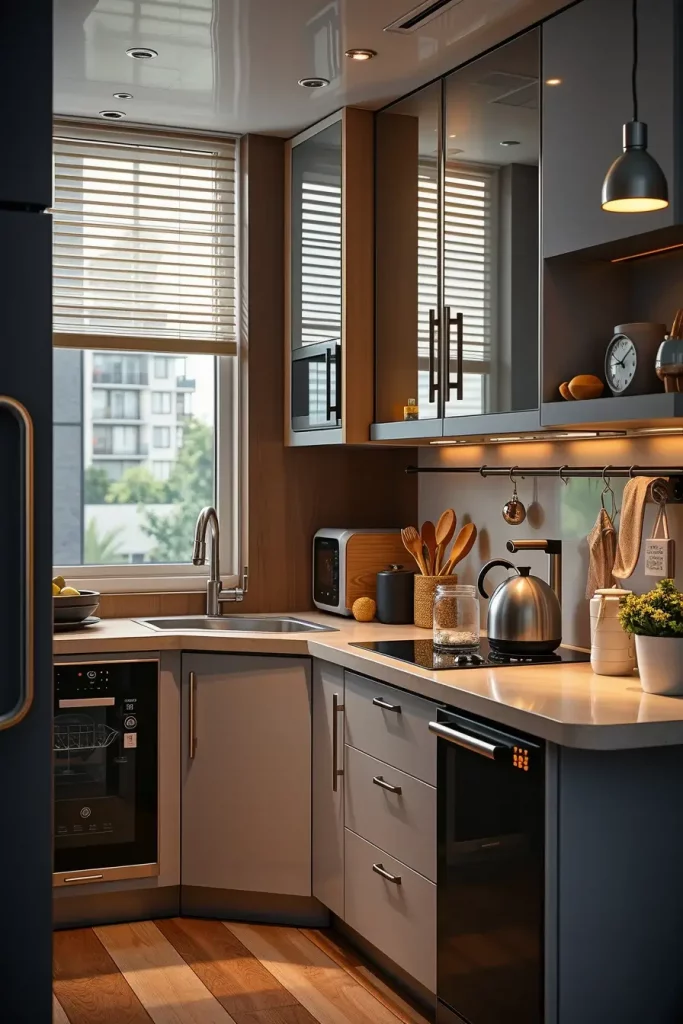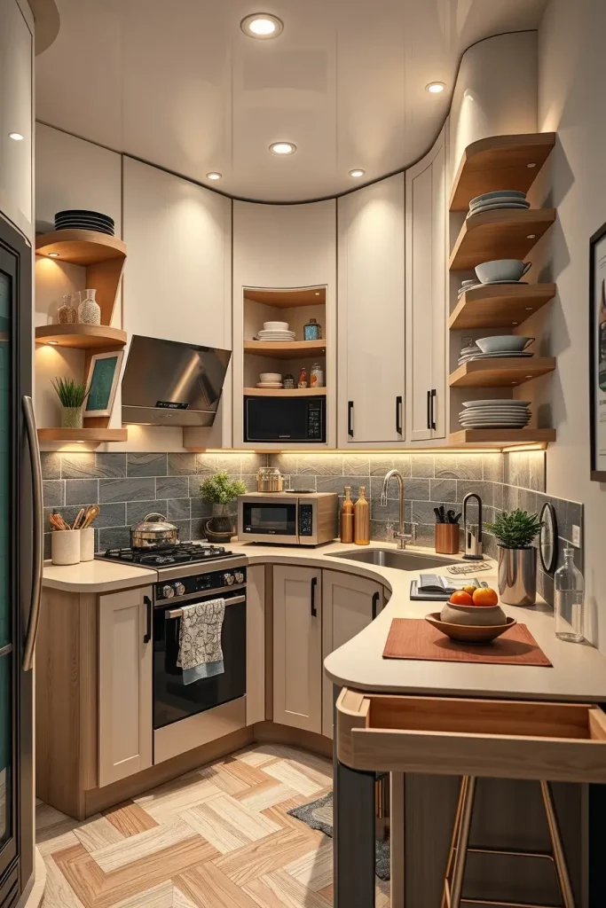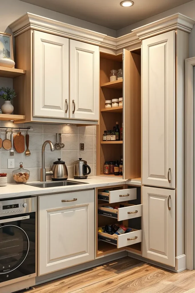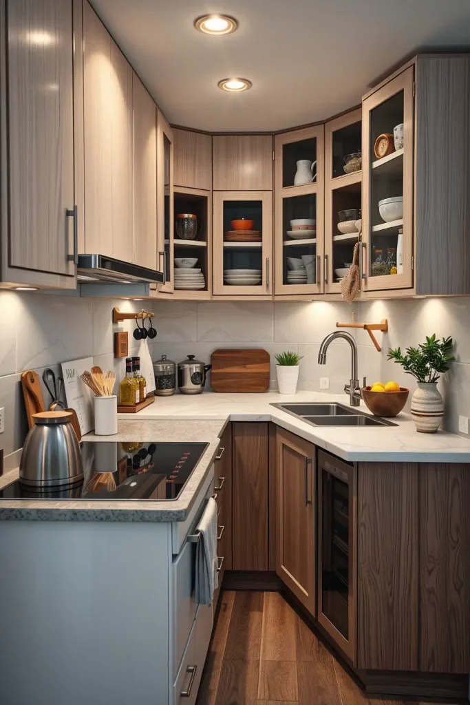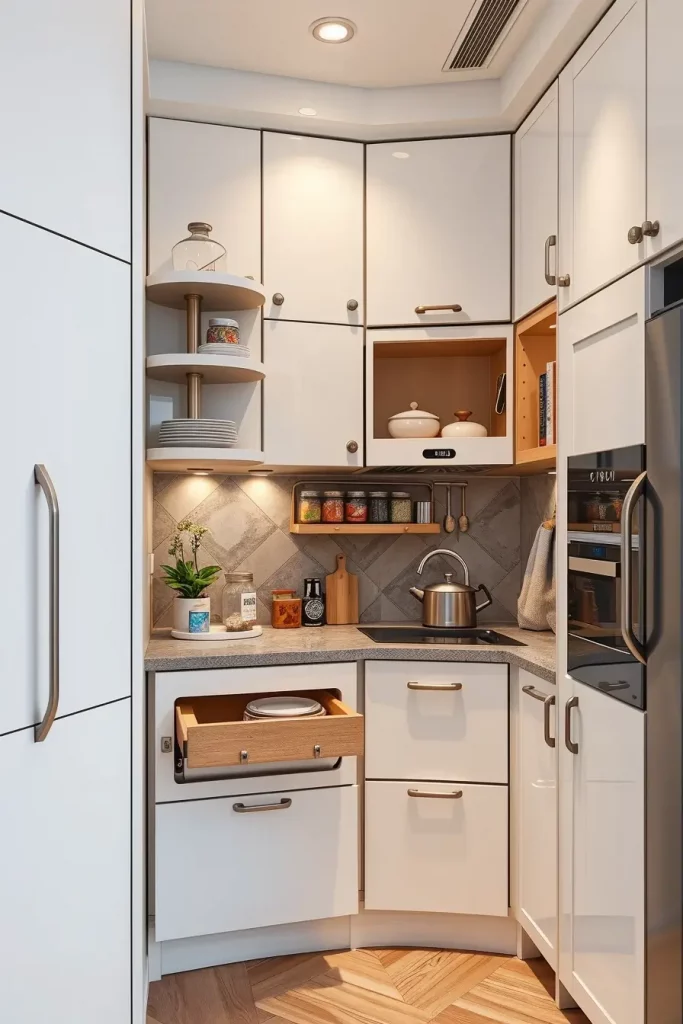 Corners represent one of the least used spaces in small kitchens, and in 2026, I would always strive to adopt new ideas to make the most of the same. It could be putting up spinning shelves, corner drawers, or curved shelves, but in any case, these enhancements will turn the dead space into a highly useful storage. Through the intelligent use of the corners, I would be able to design a more efficient layout without changing the overall design of the room.