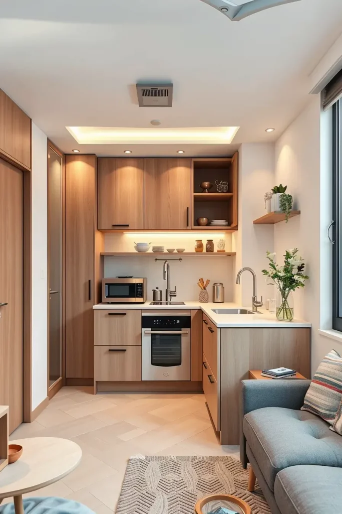 In such designs, I frequently get narrow base cabinets, thin upper vehicles and built in appliances to reduce bulk. A peninsula or fold-down countertop extension is a small peninsula, which does not need a permanent position in the floor plan to create more workspace. Lighting is also of great importance, I use under-cabinet lighting LEDs as well as overhead track lights to provide the light to all surfaces evenly. This functional layer enables the daily needs of cooking and the multi-purpose needs of people who live in studios.