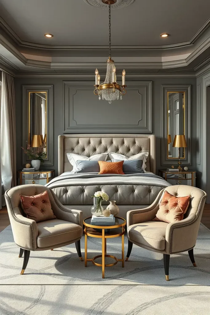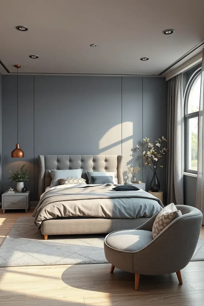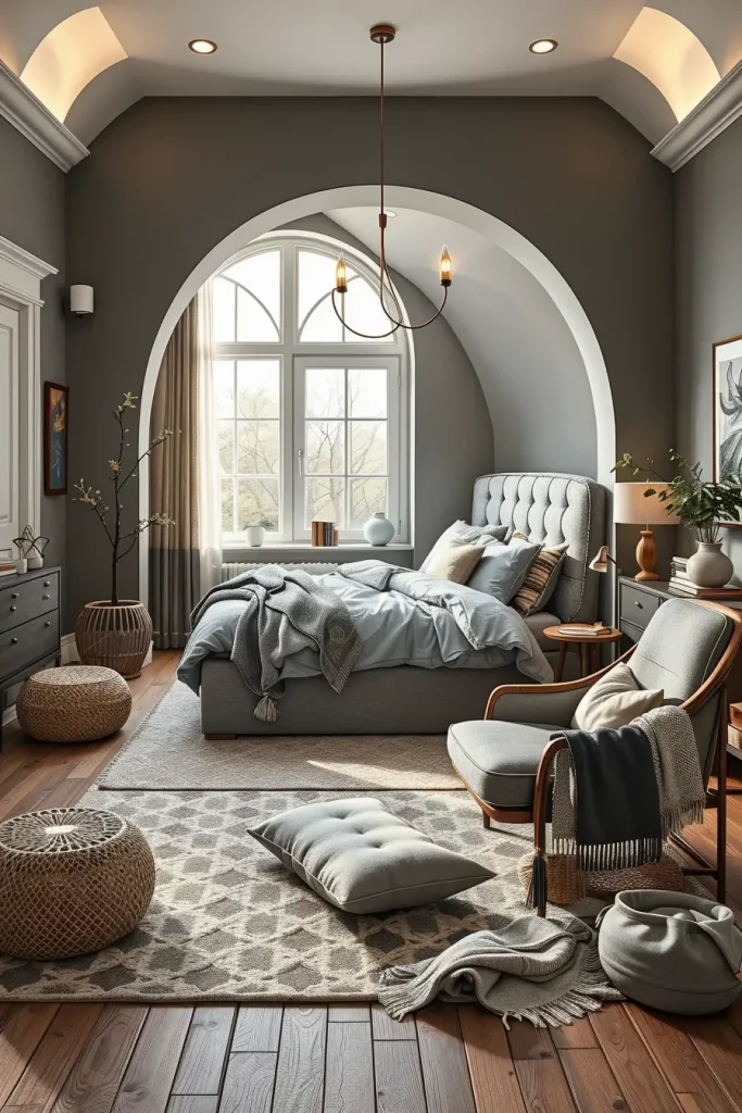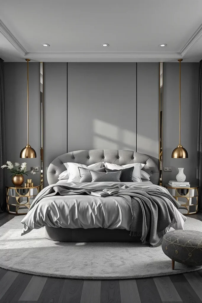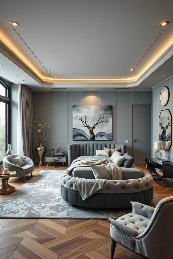 Personally, I like the look of gray bedrooms with oval sofas and beautiful accent chairs, which are luxurious and comfortable to stay. I also like that Curved furnishing furniture produces a flowing effect, which makes the whole room soft. The space is more harmonious instead of the use of sharp angles; the edges are rounded and streamlined to be welcoming and really calm. The combination of matte gray walls and plush silver or graphite textiles contributes to the balance and the warmness of the interior without saturating the senses. This design works best in the large spaces and there you can manipulate size and material to create the depth.