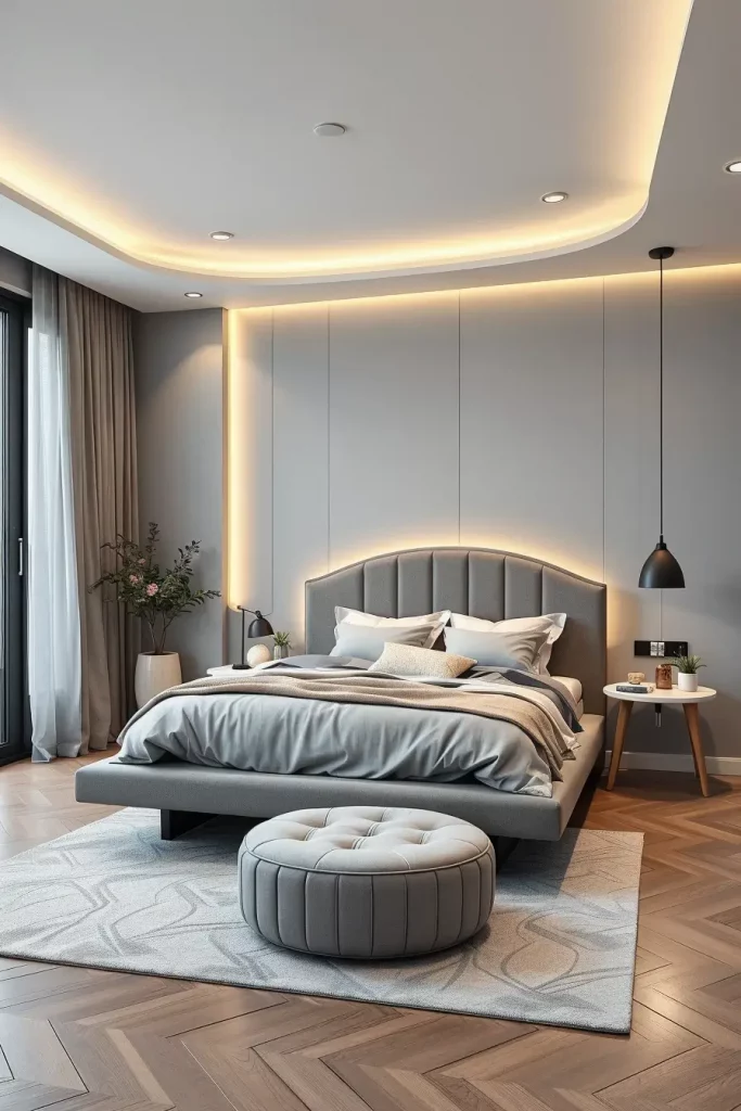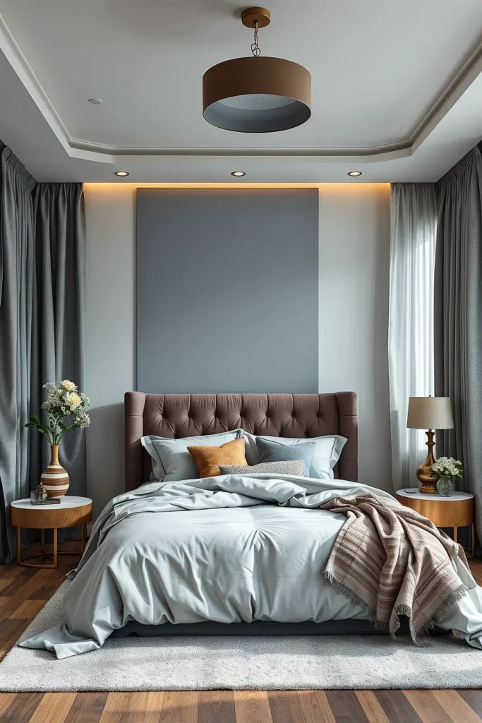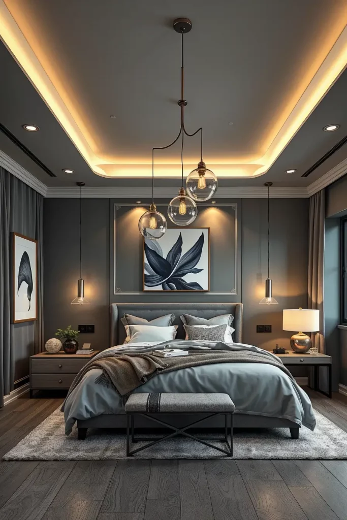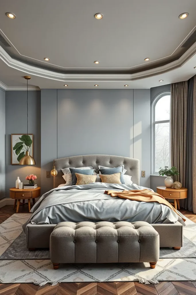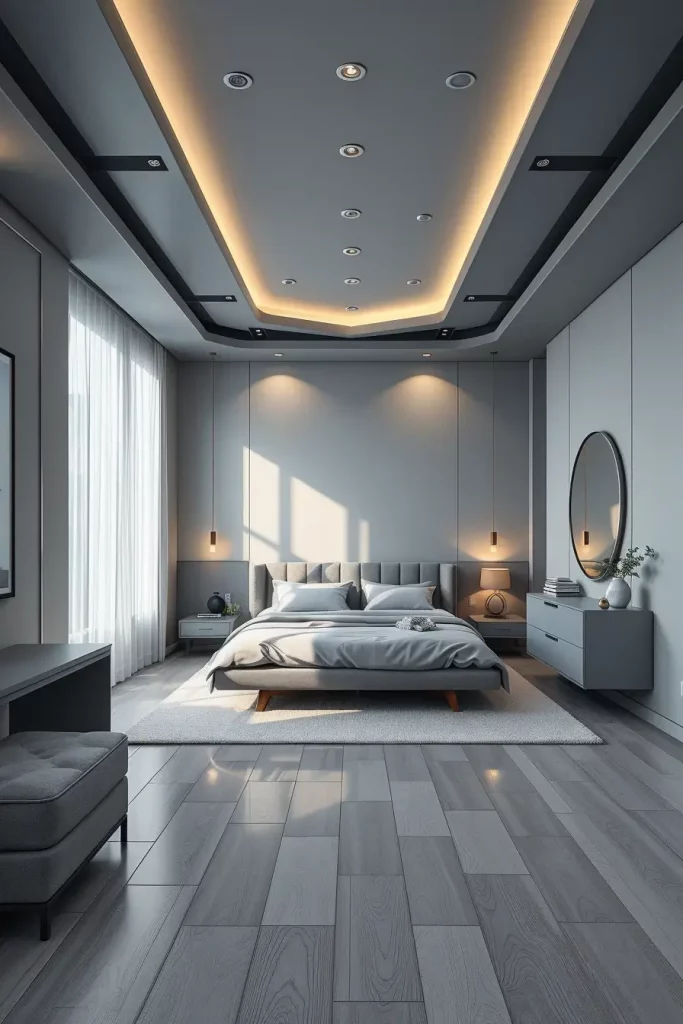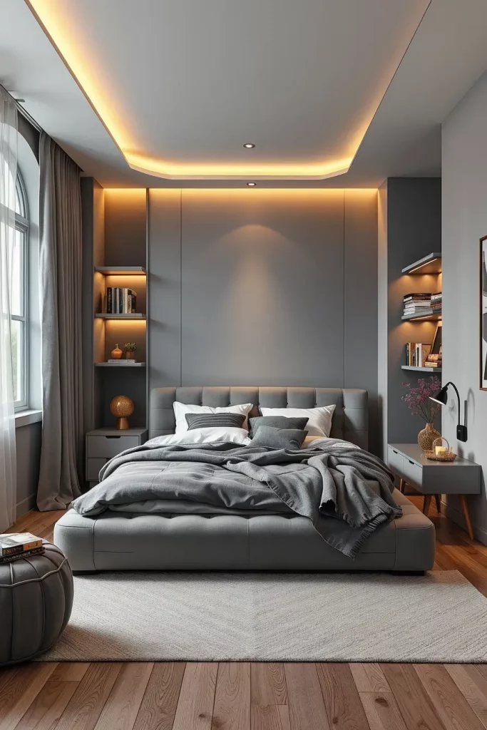 Accent ceilings are one of the most thrilling trends that will be introduced in the modern gray bedrooms in the year 2026. The perception of height and light can be changed by a well-designed ceiling and make the impression of luxury and depth.