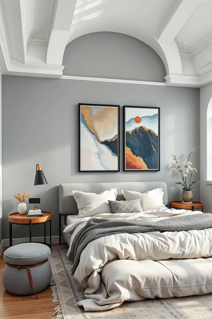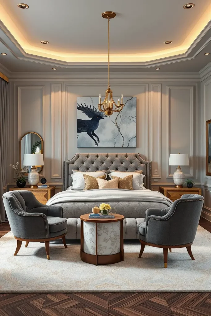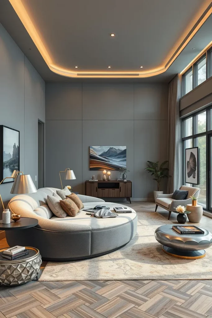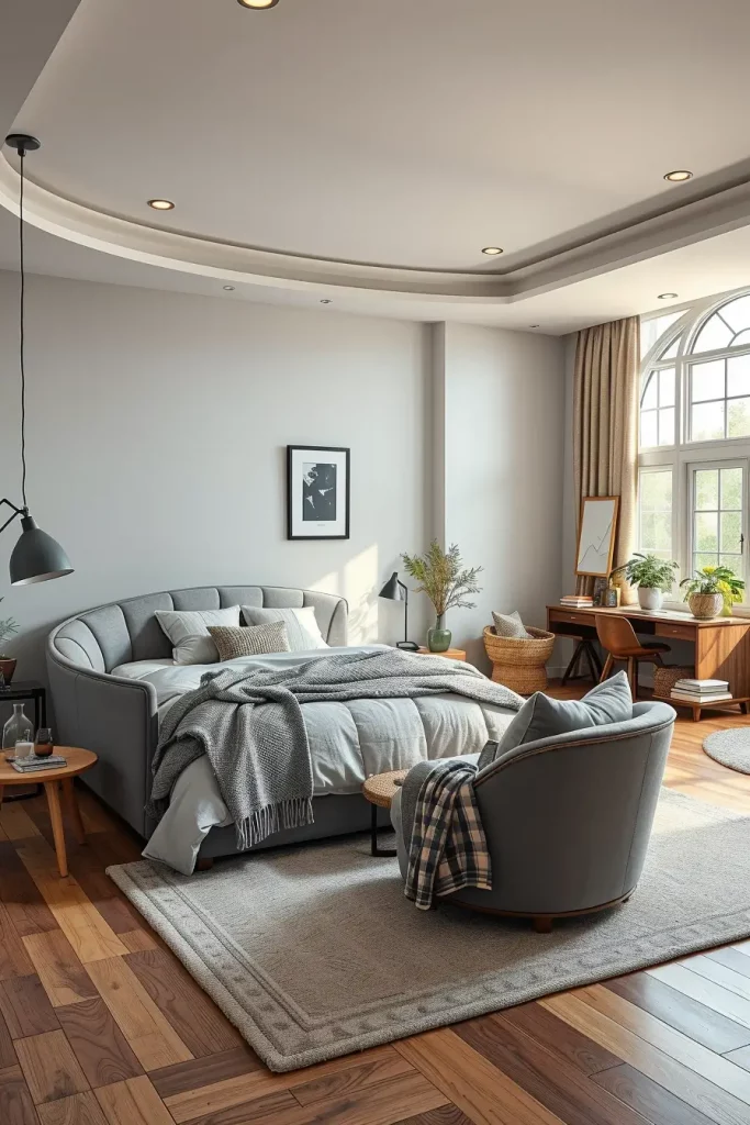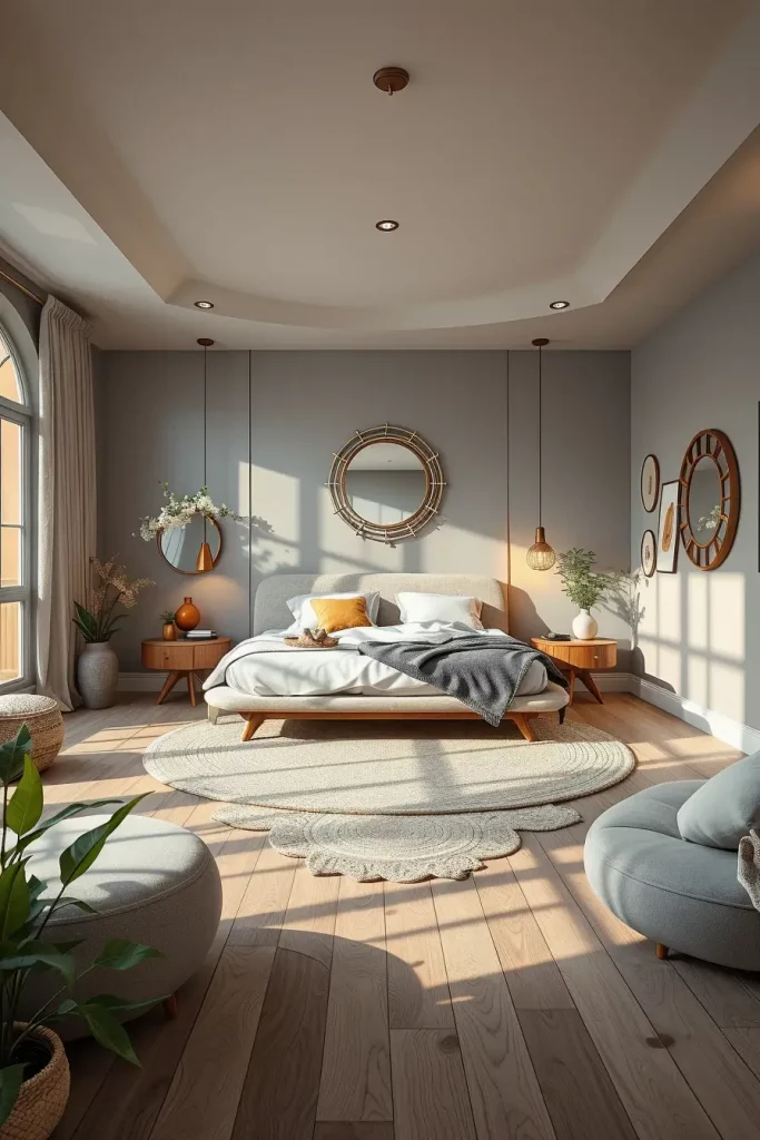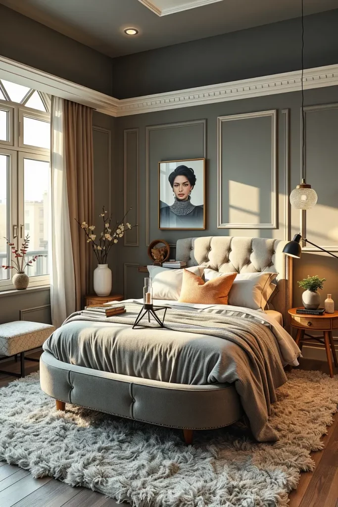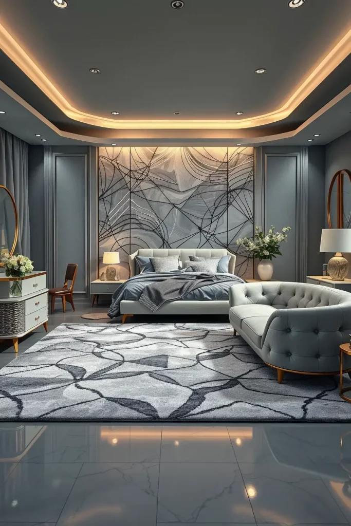 In designing these spaces, I tend to begin with a designer gray bed which has curved or oval designs as the centerpiece. Along with it, I will place the accent furniture with similar tones, e.g. a low oval sofa in charcoal velvet or a silver-colored lounge chair. The continuity is made even more with small details such as round bedside tables, ribbed wall panels, or even soft wool carpets of light gray. It is the ability to stay unified by means of form and shade and to create variety by means of materials, such as wood, brushed metal, soft fabrics.