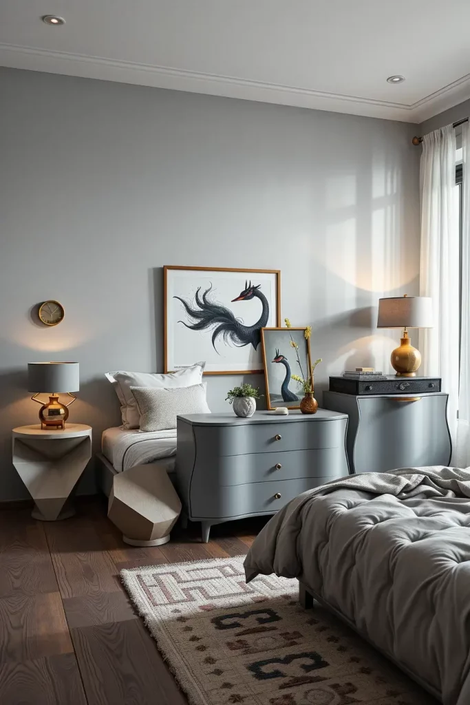 In the case of furniture, I would lean towards sleek and designer beds with low profiles and upholstered headboards made of low-profile matte gray linens. These are to be supplemented with metallic side tables or smoked glass surfaces to add to the smoothness of the appearance. I also enjoy having sculptural lamps to add depth and contrast to the lower palette.
