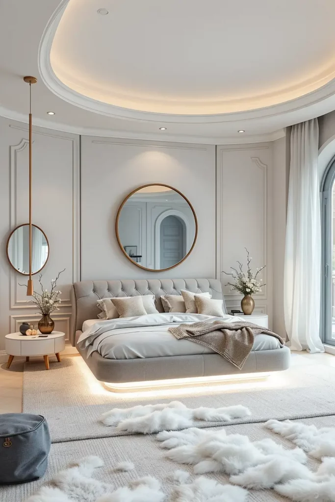 My designs incorporate oval mirrors, rounded bedside tables and soft-edge rugs to match oval beds or chairs. Ceiling lamp, area rugs and everything helps create a continuous flow. Soft gray colours are used to add to this beauty and gives a smooth imagery of passage between furniture and walls.