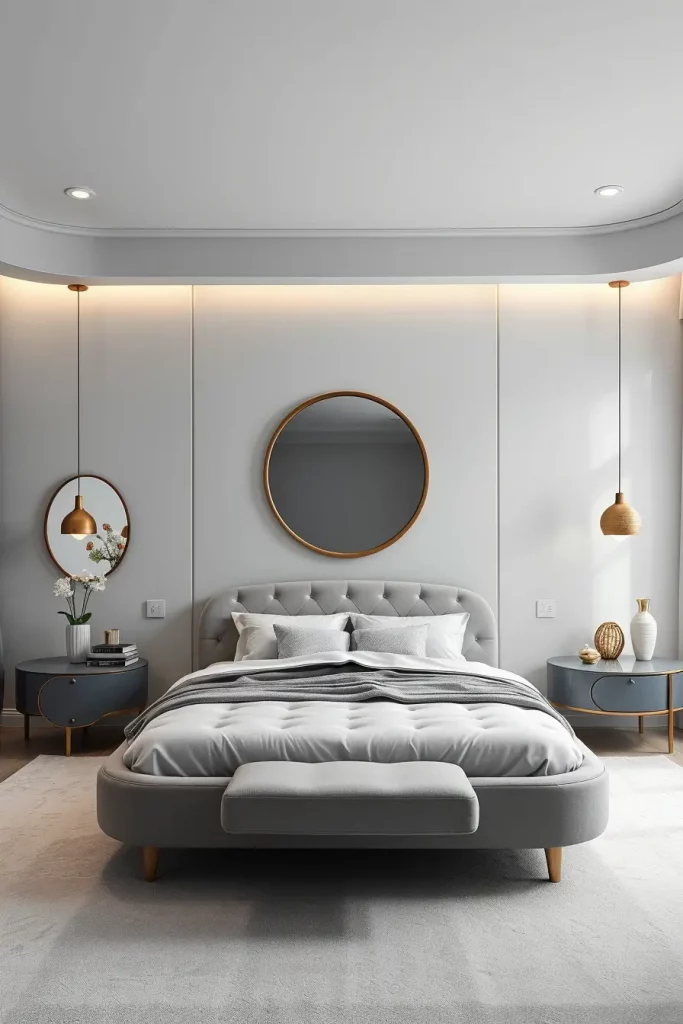 In contemporary gray bedrooms, mirrors are not only useful, but also architectural. I usually suggest curved mirrors with metal frame to make linear compositions soft and give them a beautiful reflection. The curve is idealised on grey walls which are structured and which offer a depth and flow in the whole design.