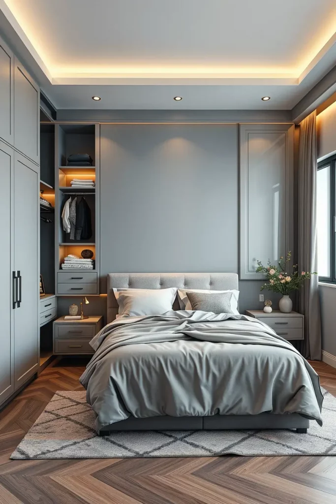 Storage does not have to be associated with the closet in a contemporary gray bedroom. I prefer slim wardrobes, floating nightstands, and shelves that are in gray finish, which goes perfectly with the walls. This gives the space visual homogenization and ensures that the space is not cluttered.