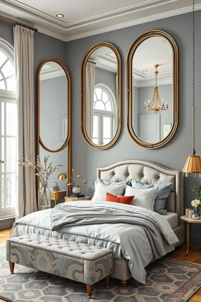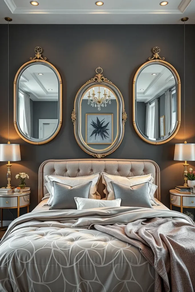 In choosing mirrors, I would choose oval or round shaped mirrors made of brushed silver or black chrome. These finishes are matched with clean furniture and designer beds covered with soft gray material. The room can be widened and illuminated with the help of two symmetrical mirrors over the nightstands.