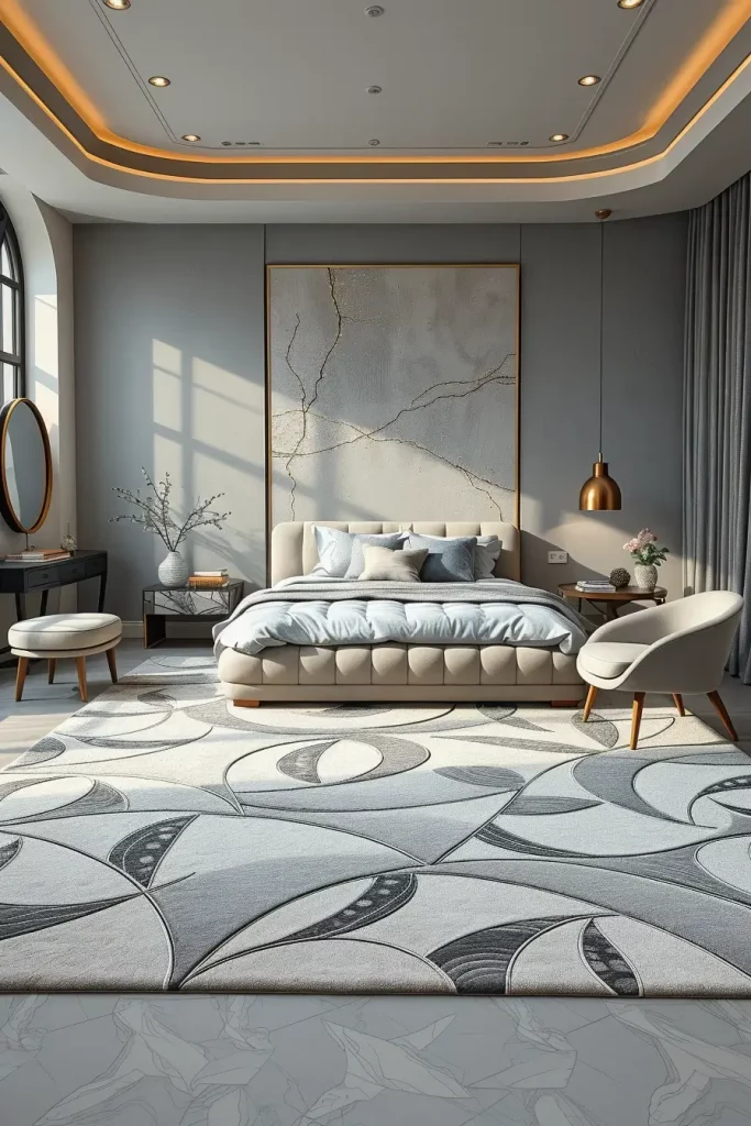 In many cases, a statement rug is the thing that brings down the whole design on a bedroom. I would use the rugs with geometrical motives or a textured weave which reminds of the elegance of the room in modern gray interiors. It is an elegant but strong attempt to give a touch of warmth and visual pace.