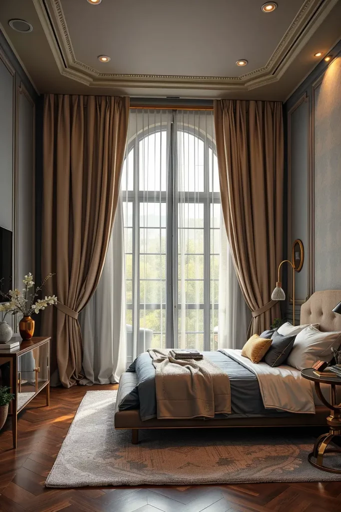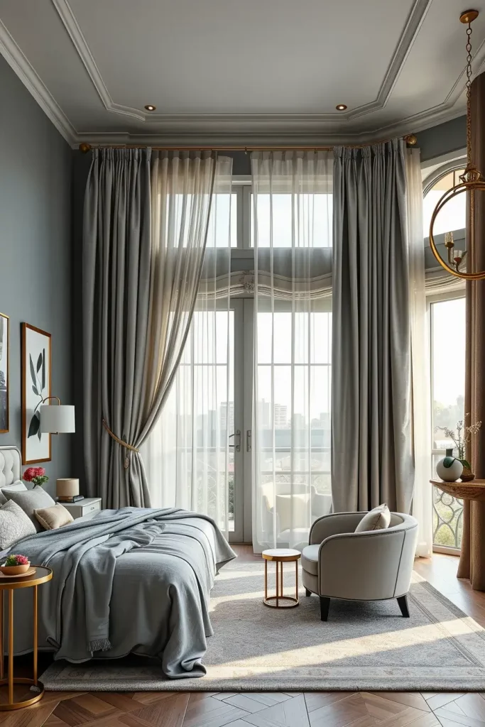 In a comfortable gray bedroom, I would suggest the use of double-layered curtains; the one on the bottom is of sheer white and the top one is of heavy dove-grays velvet or linen. Not only does this increase texture but it also contributes visual richness. The combination of curved curtain rods or metallic hardware is very aesthetic to the rest of the designer items in the room.