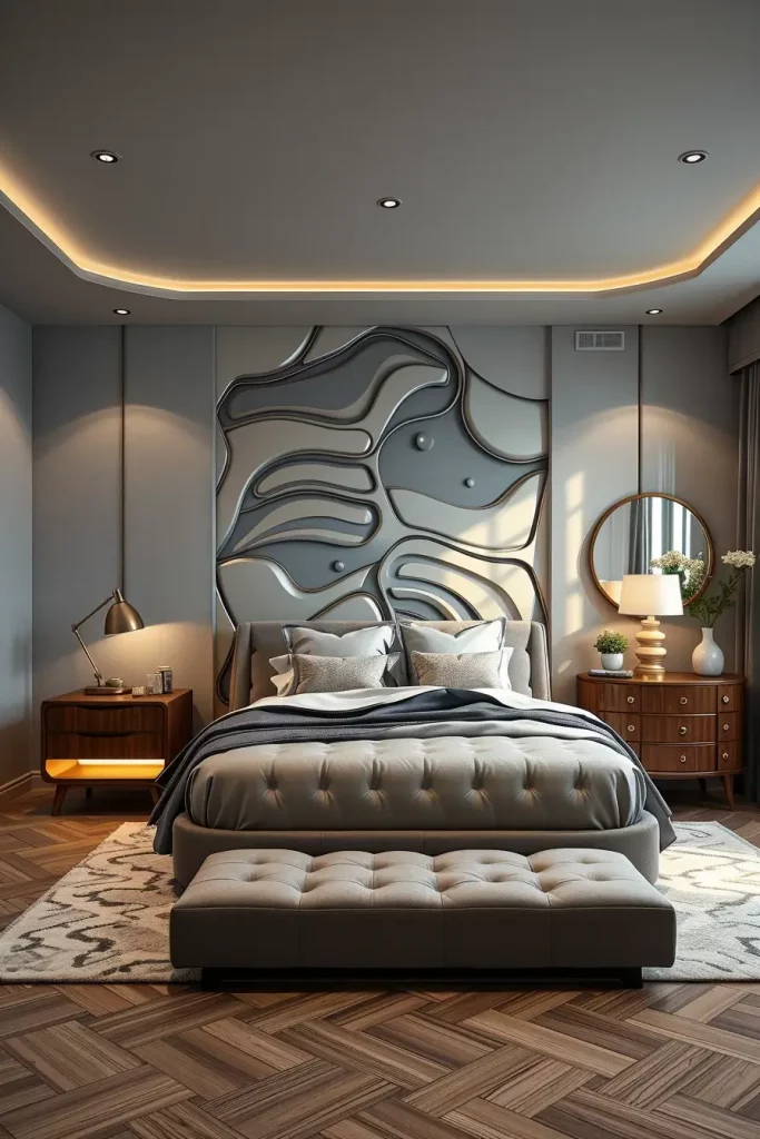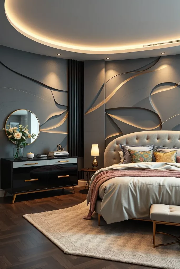 I have also applied wave-textured gray panels in the background of curved beds or light ash-colored upholstered walls in my projects. The shadows coupled with subtle lighting highlight depth and make the room look dynamically.