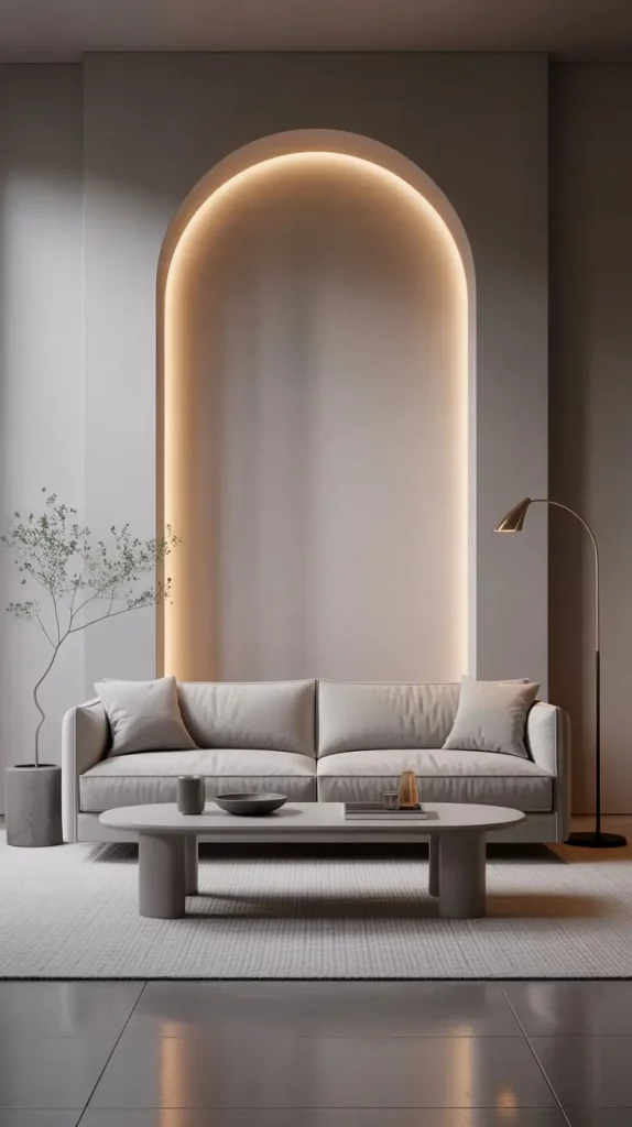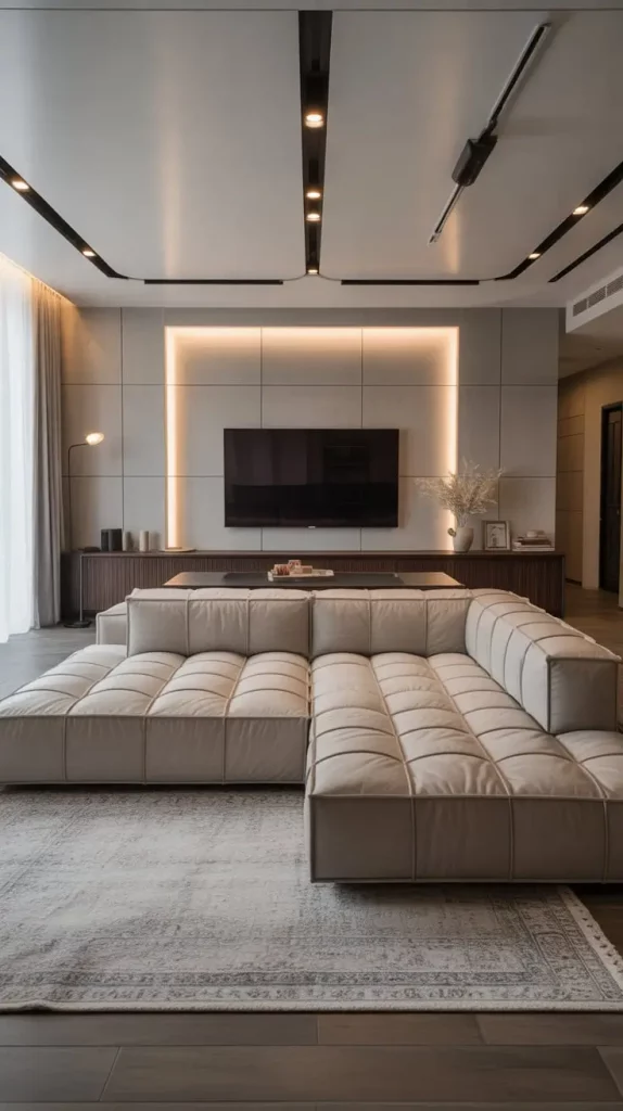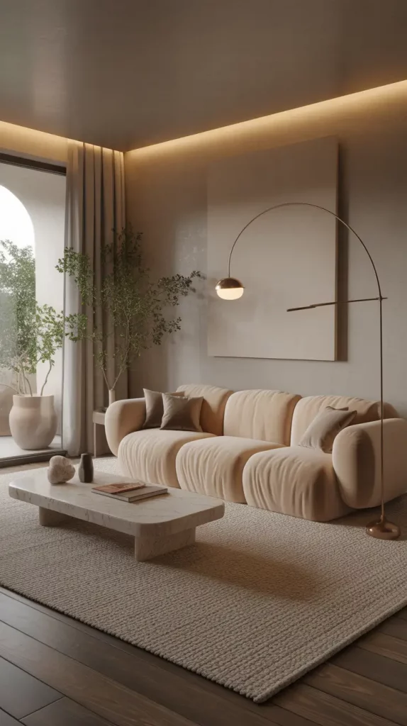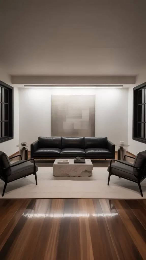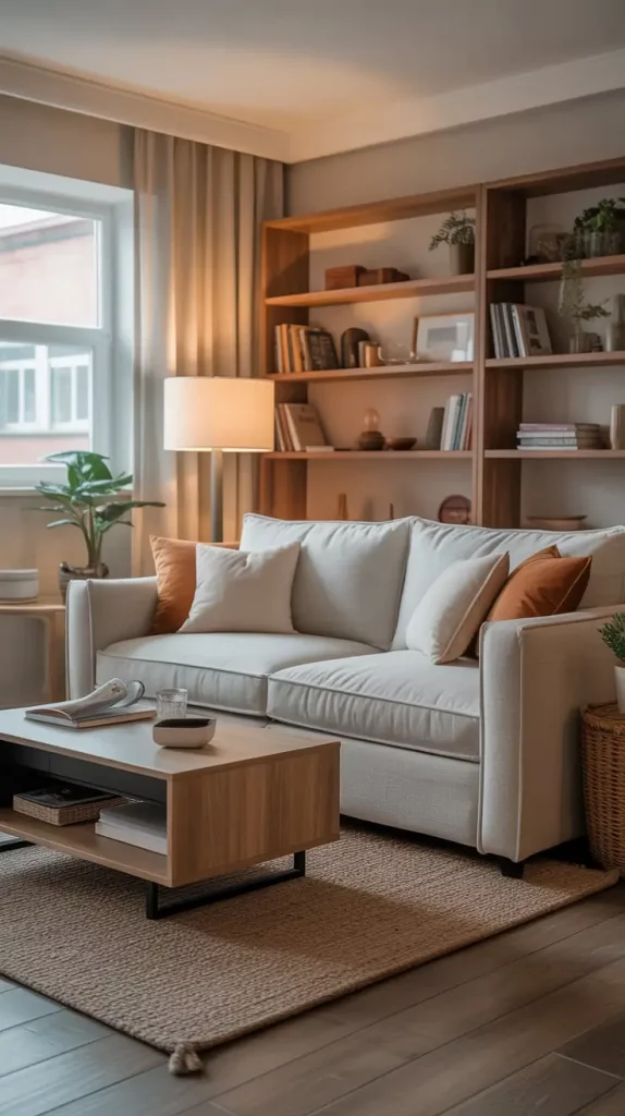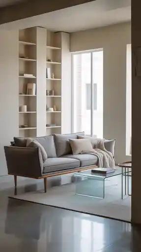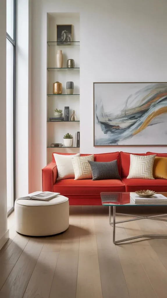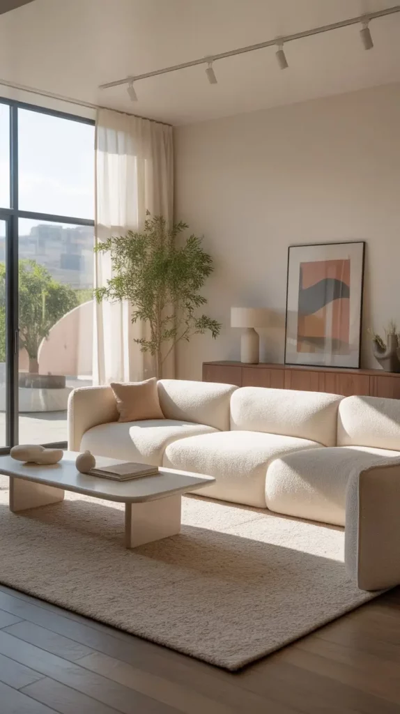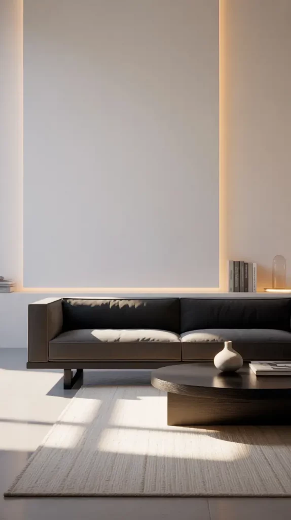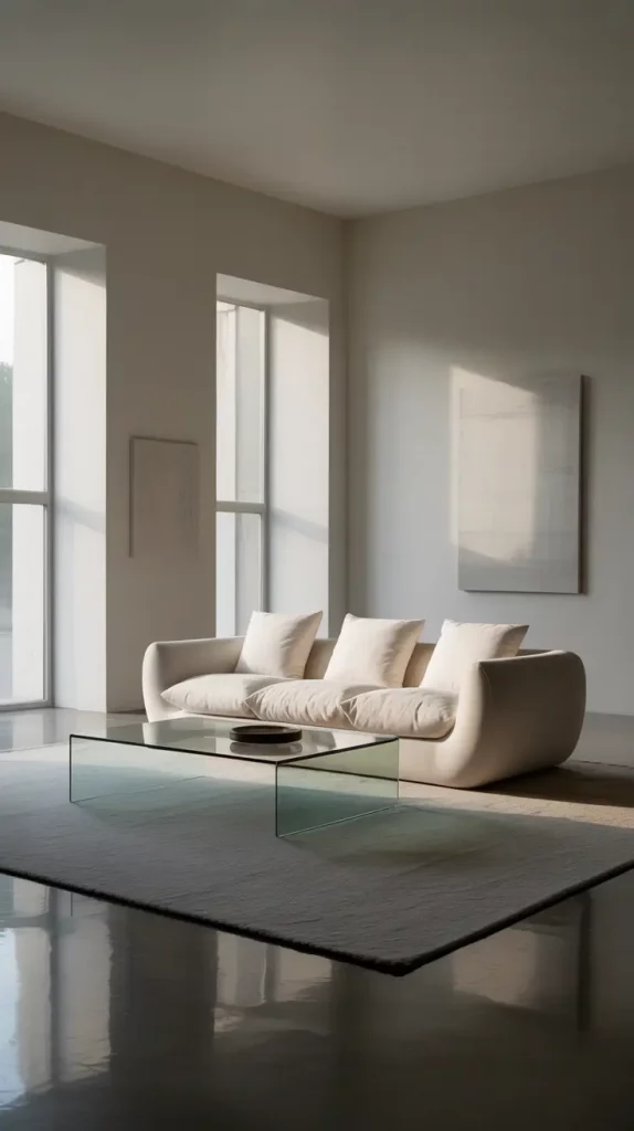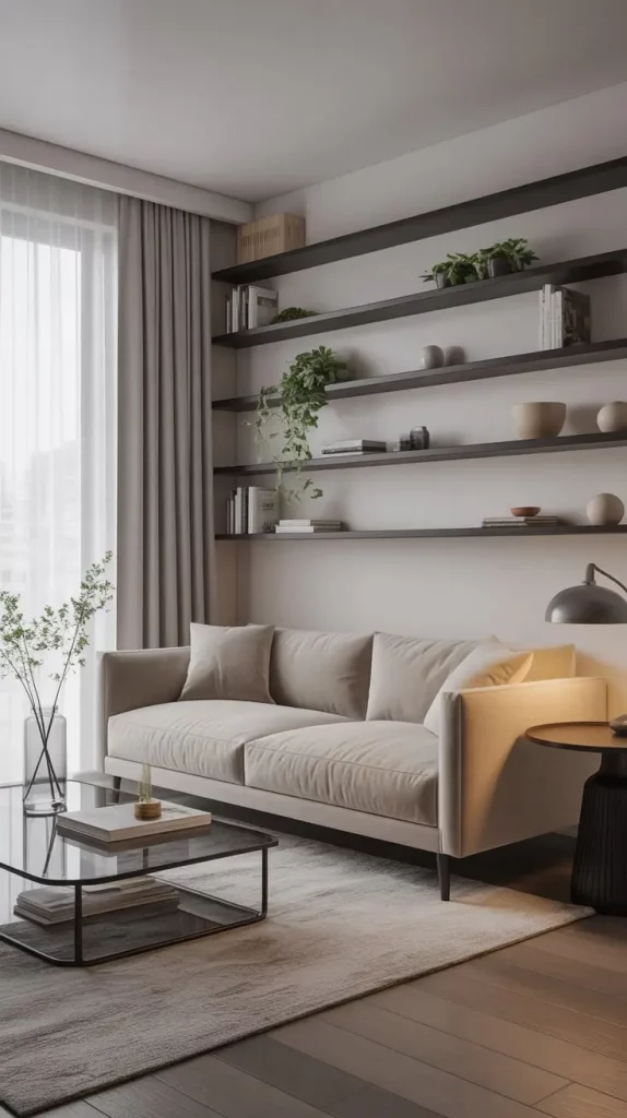 I normally match thin profile sofas with glossy side tables, mounted lights on the wall and vertical shelves. Light upholstery, such as soft beige, warm gray, or pale taupe, are used to make the room look more open. The design is made light with the use of coffee tables that have glass tops or open bases. Another thing that I enjoy doing is to add textured throws or patterned cushions to the minimal silhouette without making it look bulky.