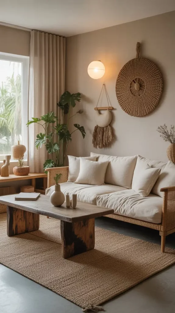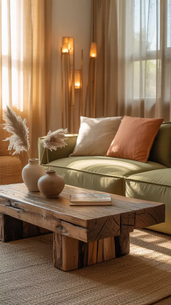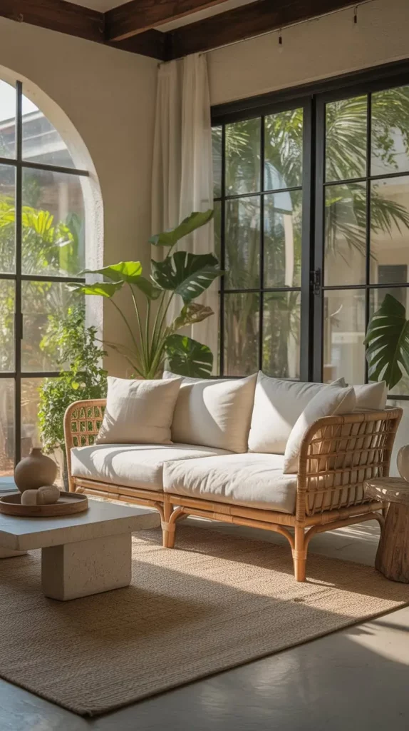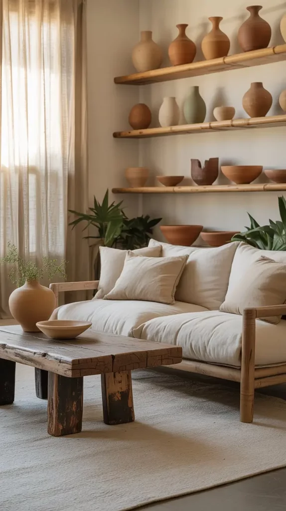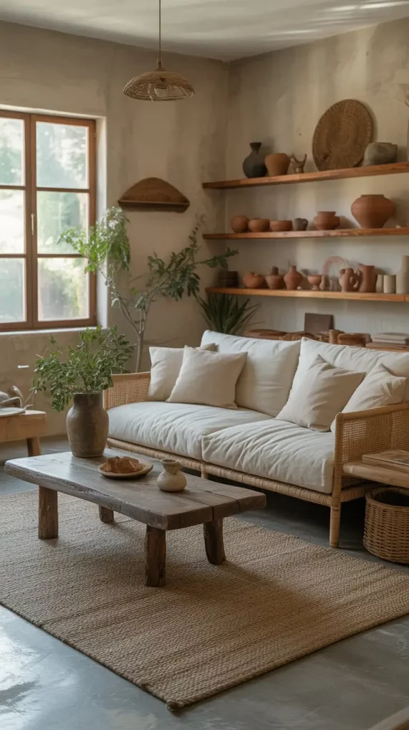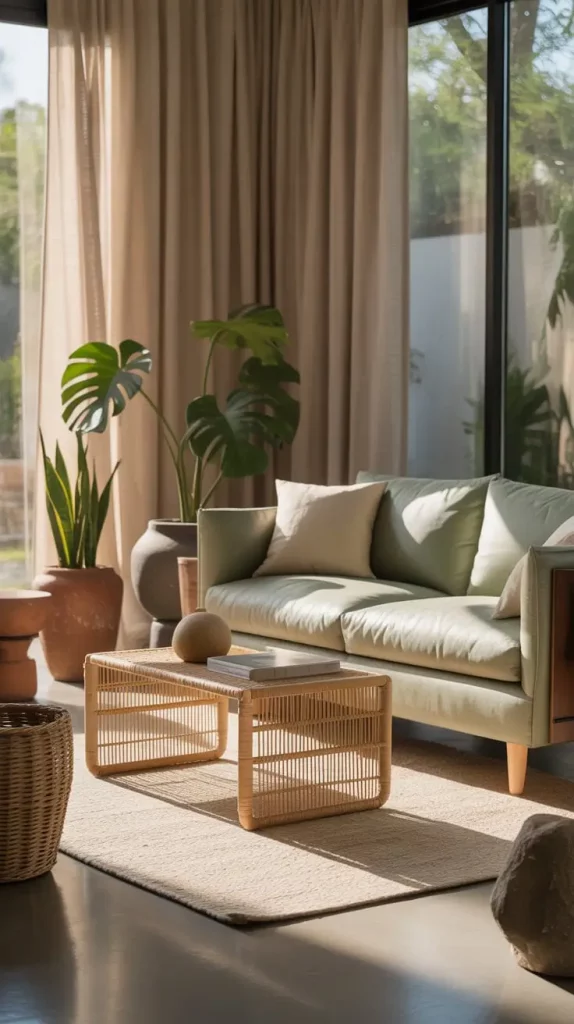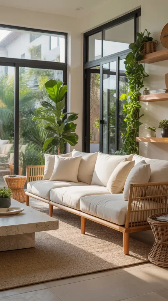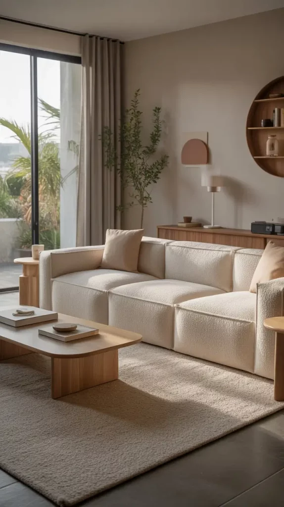 To furnish such sofas, I usually use rattan or wood coffee tables, linen curtains, jute rugs and matte black or brass lamps. The organic theme is further added by decorative touches like handmade pottery or woven baskets, or ceramic planters. The overlay of natural textures makes the room rich and harmonious.