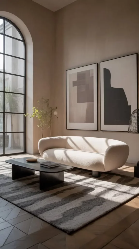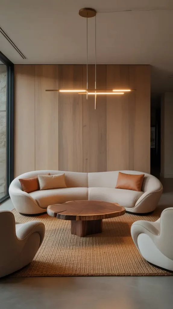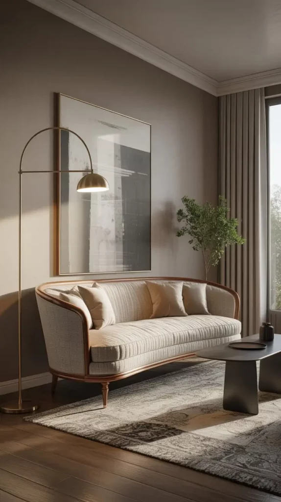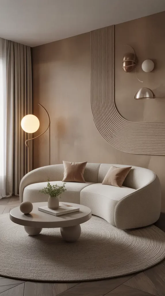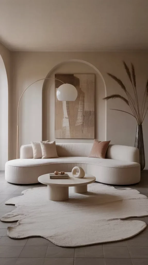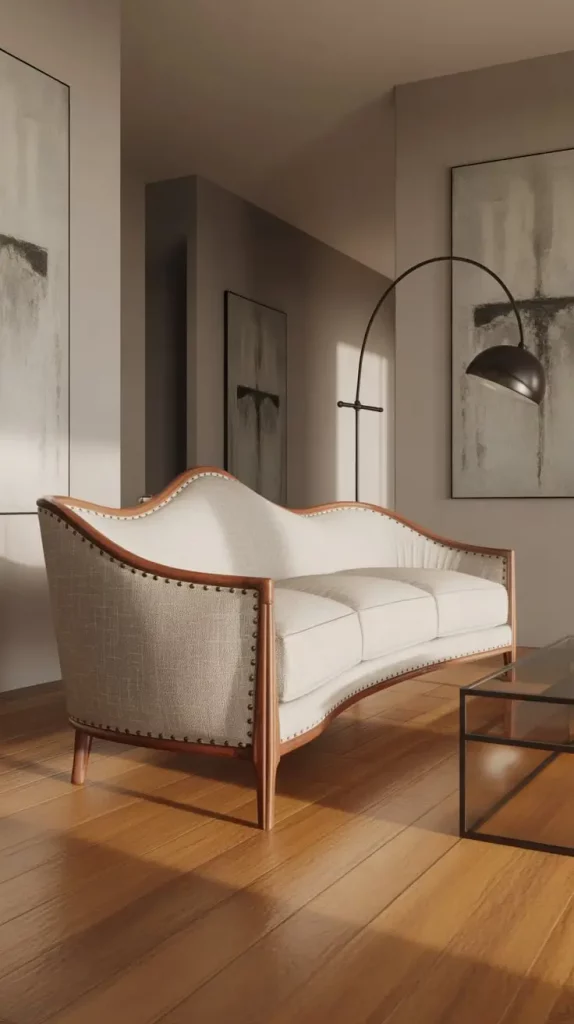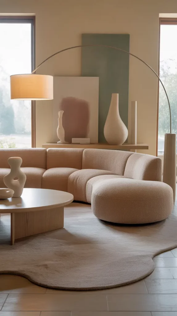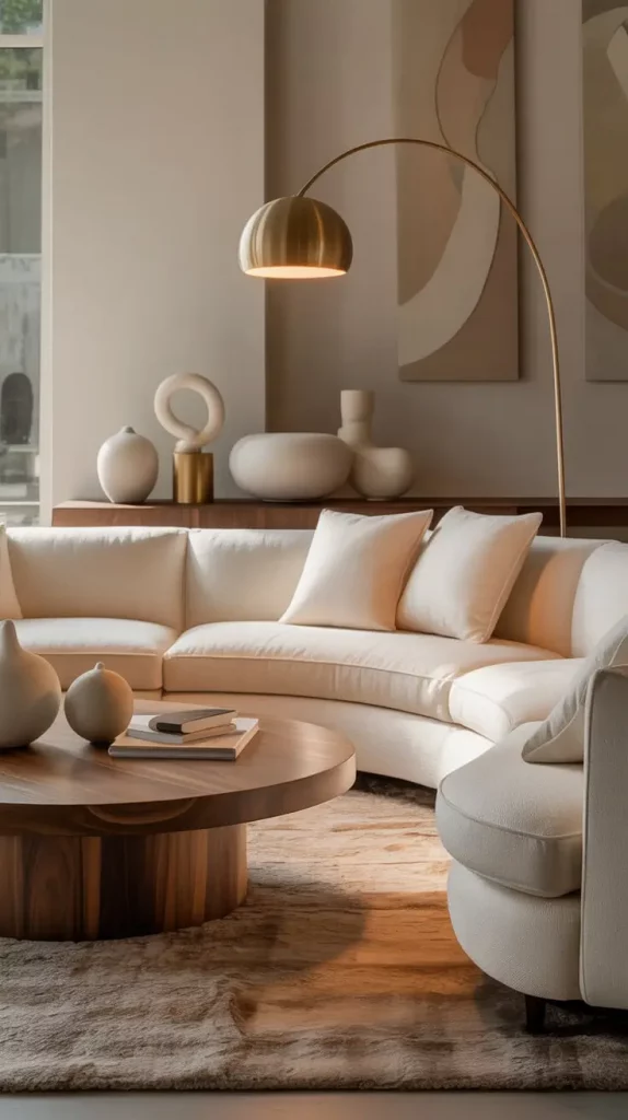 In designing curved sofas, I have resorted to using a round coffee table, sculpture floor lamps, and textured area rugs. The fluid aspect is also supported by organic forms such as oval side table or spherical decor items. Soft neutral or warm earthy upholstery adds the modern flair of the curved designs. The other favorite feature I make to use in the room is the wall art done in abstract curves to form a continuity in the room.
