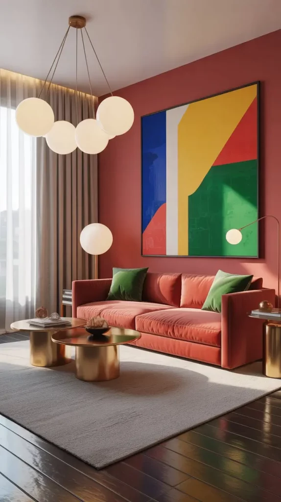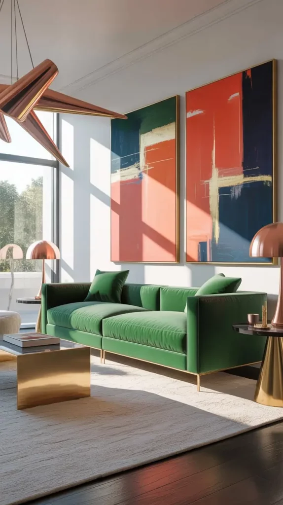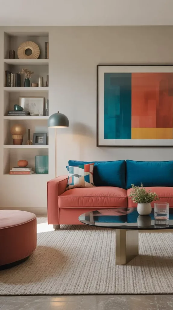 I usually combine bright sofas with contrasting accent items: round ottomans with a quiet color scheme, the coffee tables are made of glass topped to prevent overcrowding the space, and narrow bookshelves which reflect the color palette on the sofa in their selection of accessories. Geometrical shaped throw pillows assist in unifying the colors of the room although abstract artworks glue everything. This strategy will make the sofa look deliberate and not accidental.