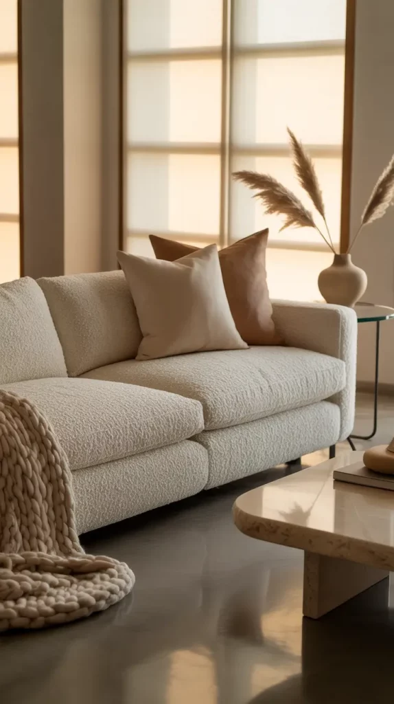 In creating the textured sofas look I tend to balance it out with the smooth accessories: stone coffee table, glass side tables, neutral rugs and matte metal lighting. The cozy feel can be increased with layered textures such as knitted throws or embroidered cushions that will leave the space uncluttered. Natural materials including wood, clay and woven fibers are equally matched with textured upholstery.