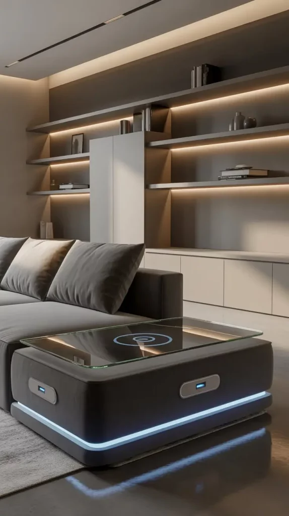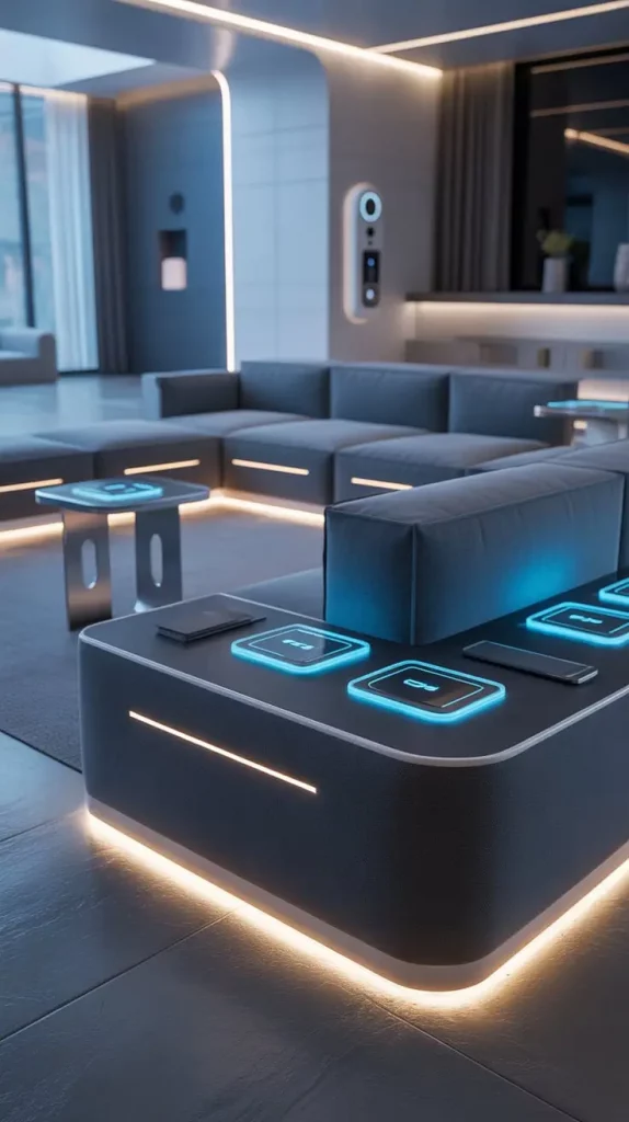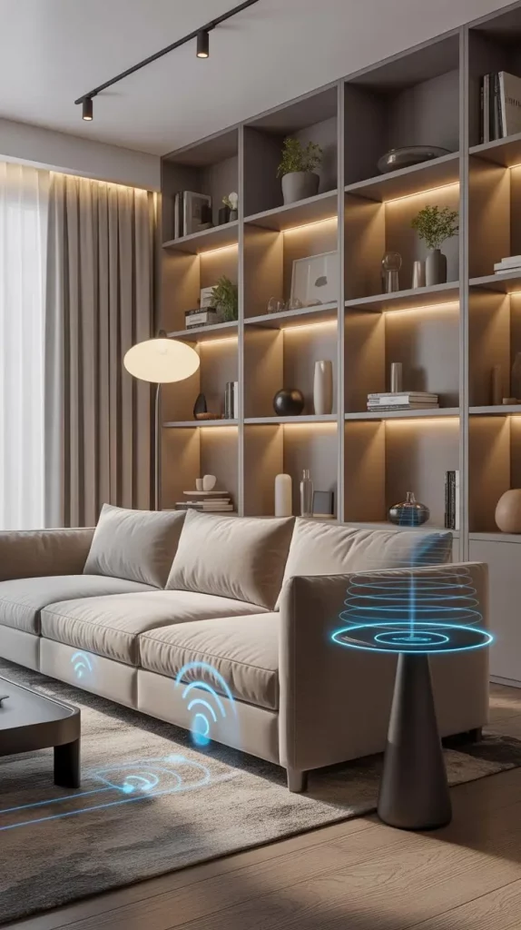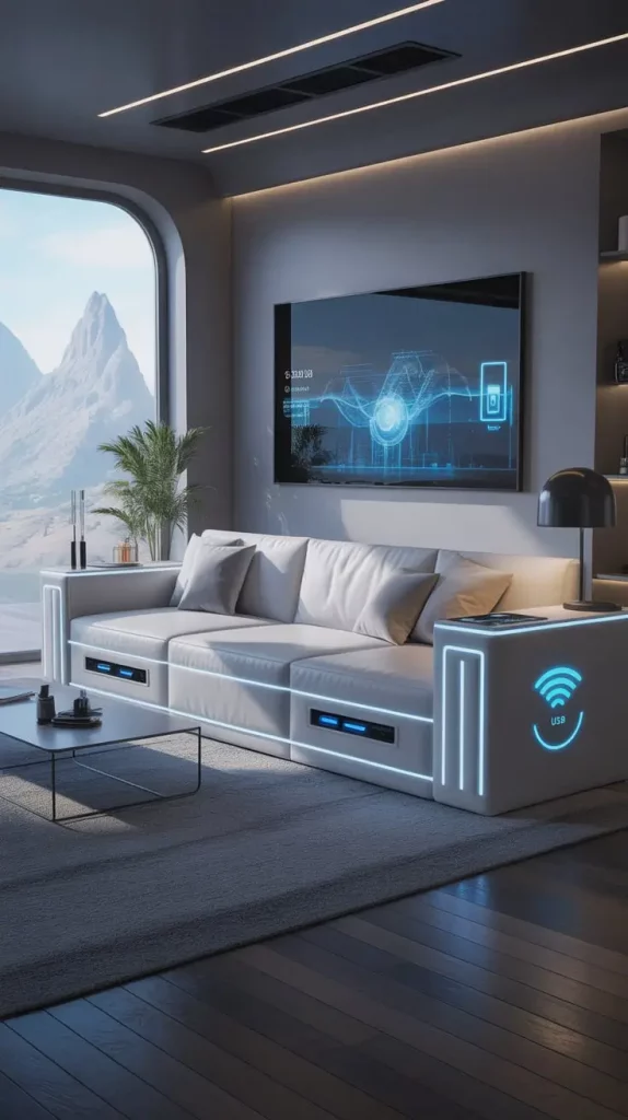 To complement this idea further, I would incorporate ambient LED lighting in the background behind the sofa or beneath floating shelves to increase the technological appeal.