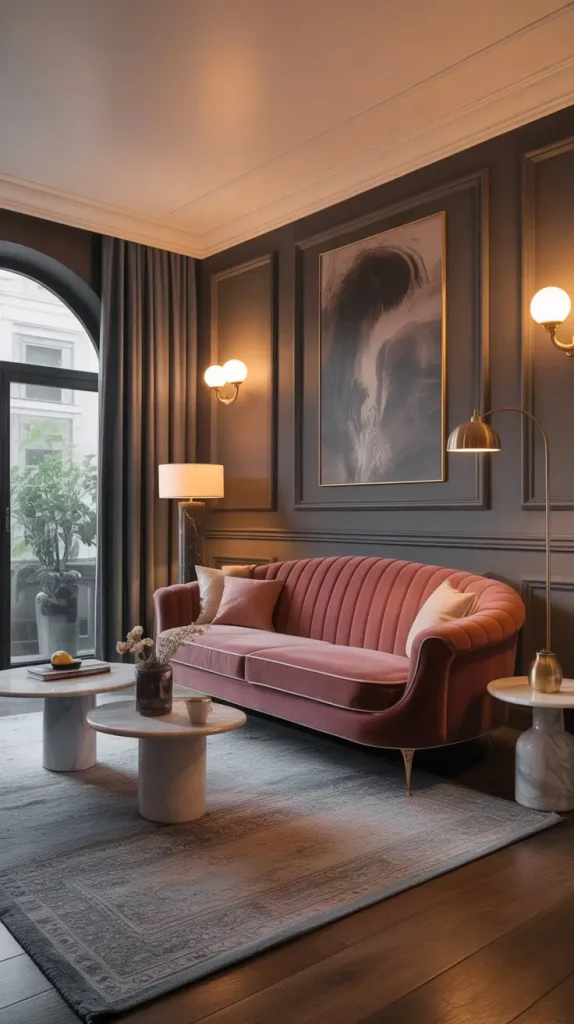 The addition of each item in this design, be it a tufted sofa, a channel-back model or a sleek contemporary silhouette will add sophistication and comfort. I tend to introduce marble side tables and brass floor lamps and textured carpets to the softness of velvet. These factors are useful in developing a harmonious and unified atmosphere.